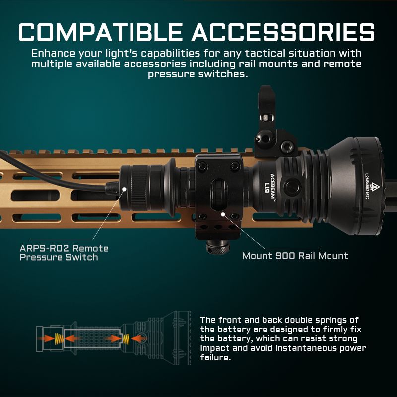 Acebeam L19 is a long-range hunting flashlight that can throw a maximum of 2200 lumens 1520m—that’s over half of a mile! Use a TIR lens. The head diameter of the lens is 55mm, which is the hunting flashlight with the longest-throw distance in the same head diameter. The Acebeam L19 will be your new go-to hunting flashlight, and you can’t beat the long-distance capabilities. Extend runtimes when using the included 21700 li-ion battery and know its status with the battery level indicator. IP68-rated waterproof and dustproof rounds out the features of this spotlight built for those needing a small, tough flashlight with an incredibly far beam distance.