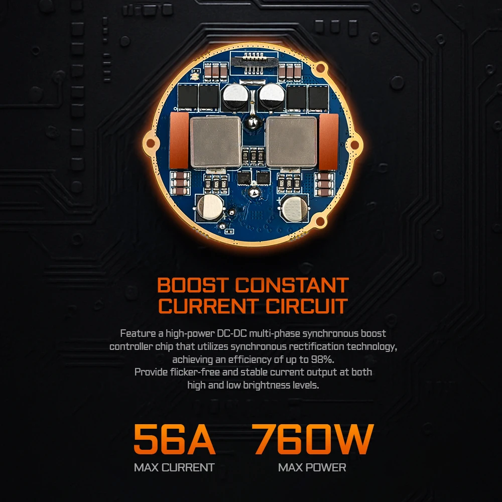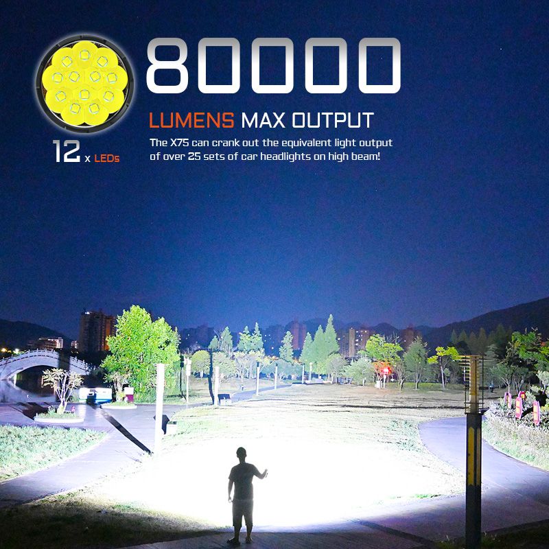 Turbo: 80000 ~ 12000 ~ 900 lumens; 330625cd; 1150 meters; 3 seconds + 42 minutes + 8 minutes
