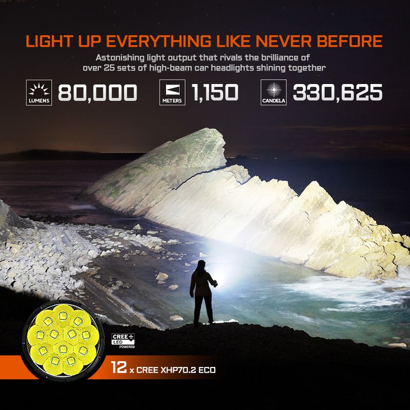 Turbo: 80000 ~ 6800 ~ 900 lumens; 330625cd; 1150 meters; 20 seconds + 70 minutes + 8 minutes