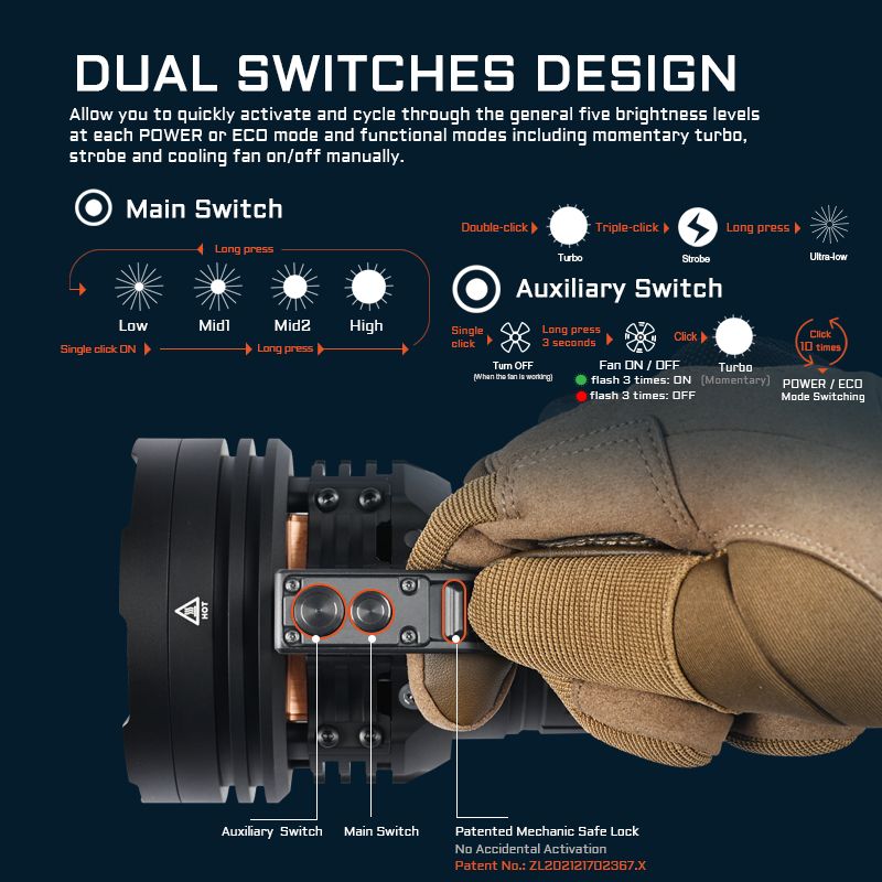 High: 23000 ~ 6800 ~ 900 lumens; 96721cd; 622 meters; 4 minutes + 72 minutes + 8 minutes