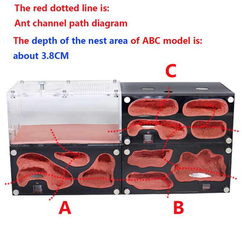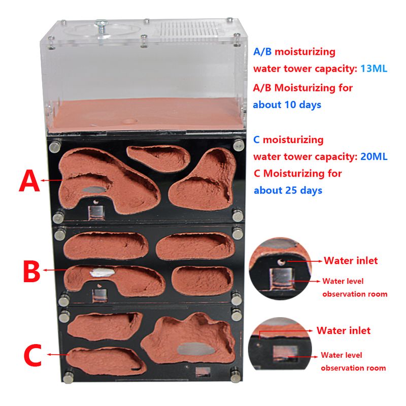 6. The nest room comes with a moisturizing water tower, the AB model can last for about 10 days, and the C model can last for about 25 days. (Note: the amount of water will affect the maintenance days due to the ant nest storage environment!)