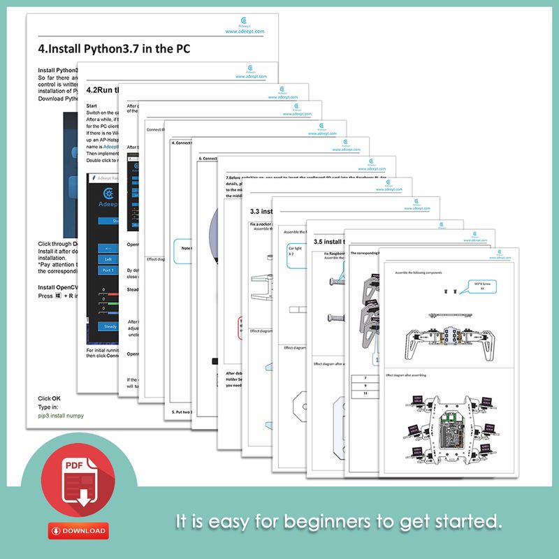 3. Easy to Assemble and Coding - A PDF manual with illustrations is considerately prepared for you, which teaches you to assemble your Raspberry Pi robot step by step; Easy-to-understand Python code is provided, with beautiful and practical GUI program(compatible with Windows and Linux operating systems). Please download: https://www.adeept.com/learn/detail-37.html