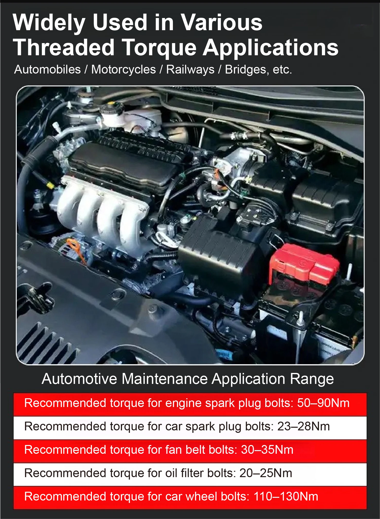 Perfect for automotive repair, motorcycle maintenance, bicycle adjustment, industrial assembly, and infrastructure work such as railway and bridge projects.
