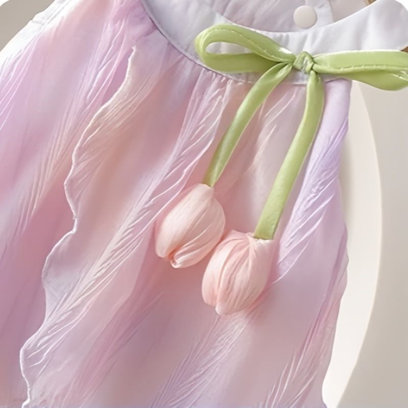 2. **Charming Tulip Accents**: Adorable tulip decorations with green bows add a sweet, playful touch, making the romper dress irresistibly cute.
