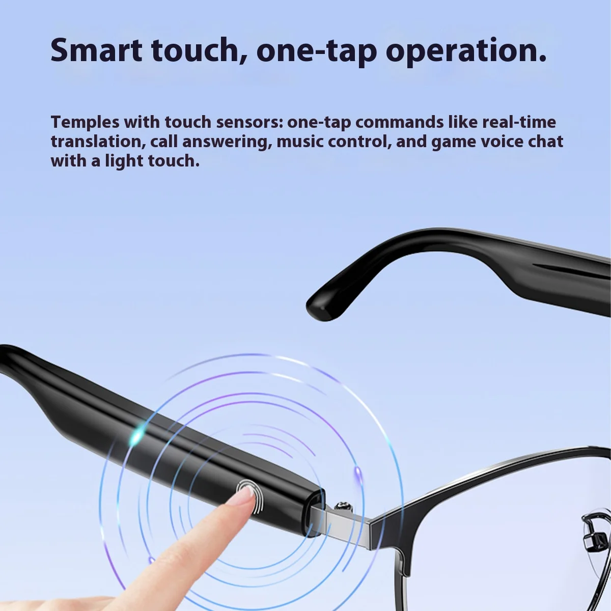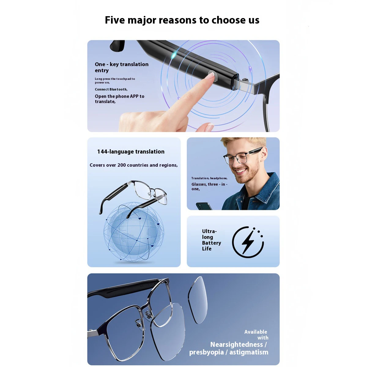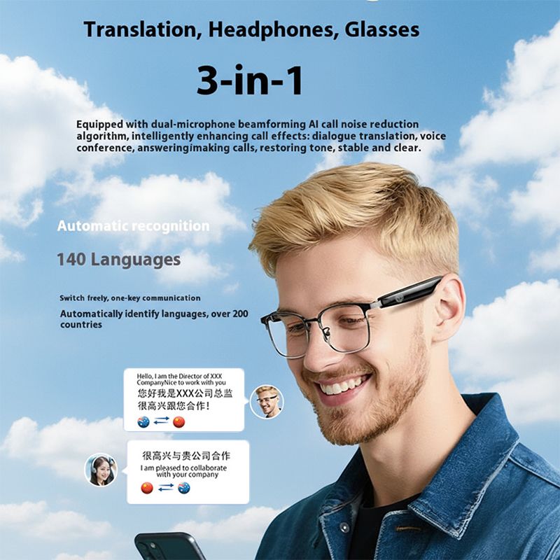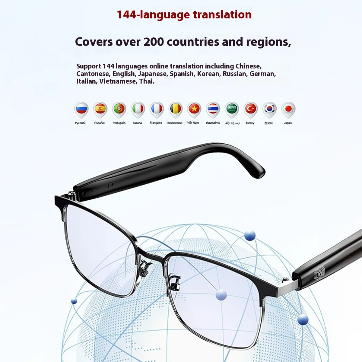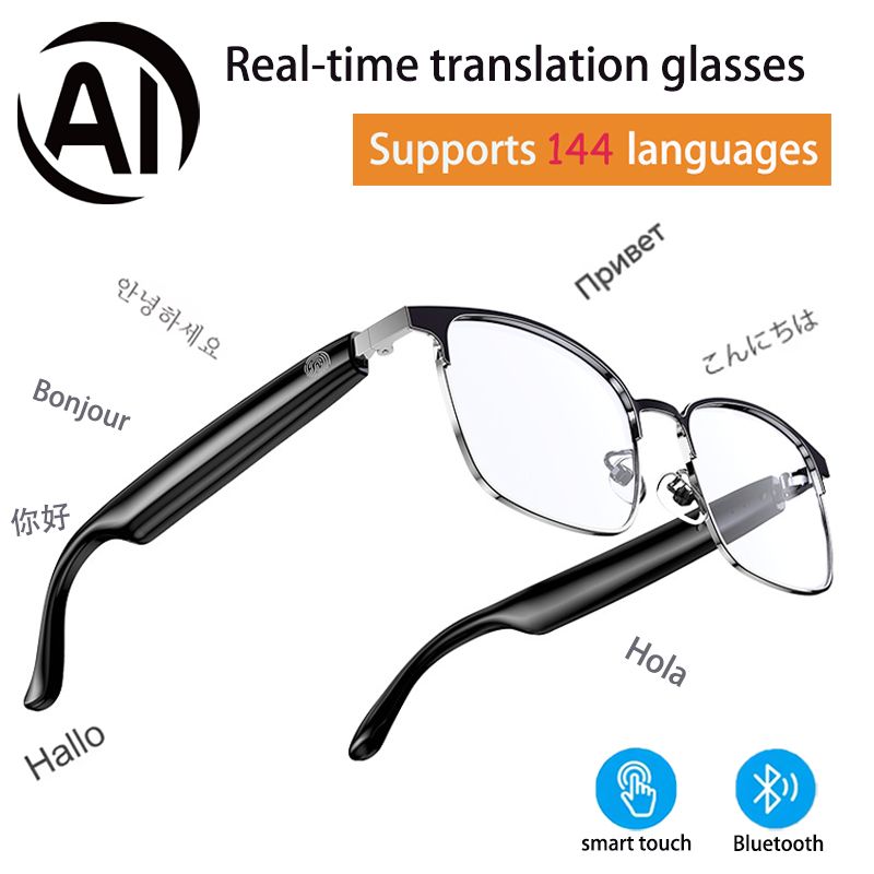 AI smart glasses,translation glasses,AI Translation Real-timeNice to meet you! Let me give you a brief introduction. We offer a variety of very stylish wireless Bluetooth glasses, available in multiple colors and styles, including regular Bluetooth glasses (without translation functionality) as well as AI real-time translation glasses that support multiple languages. The app's language defaults to match the phone's system language. These glasses are essential for business travel, remote meetings, and sports, combining headphones and glasses into one music device.