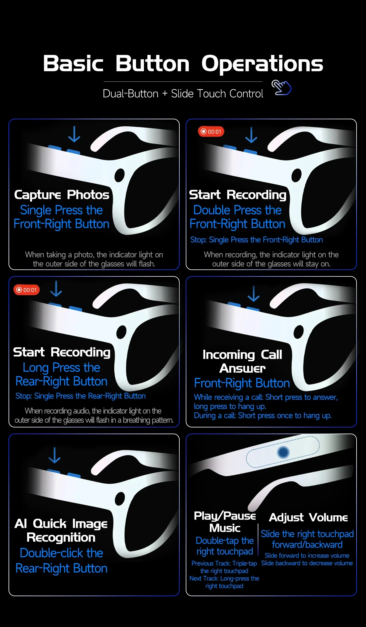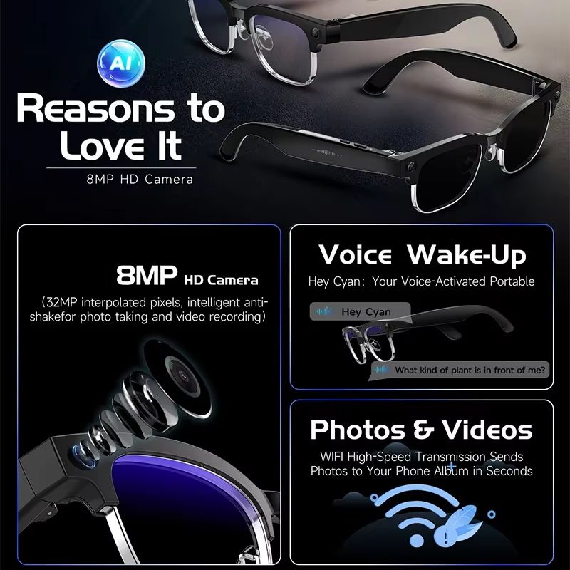 AI smart camera glasses 800W HD camera recording WIFI transmission AI voice assistant Bluetooth call IP66waterproof smartglasses