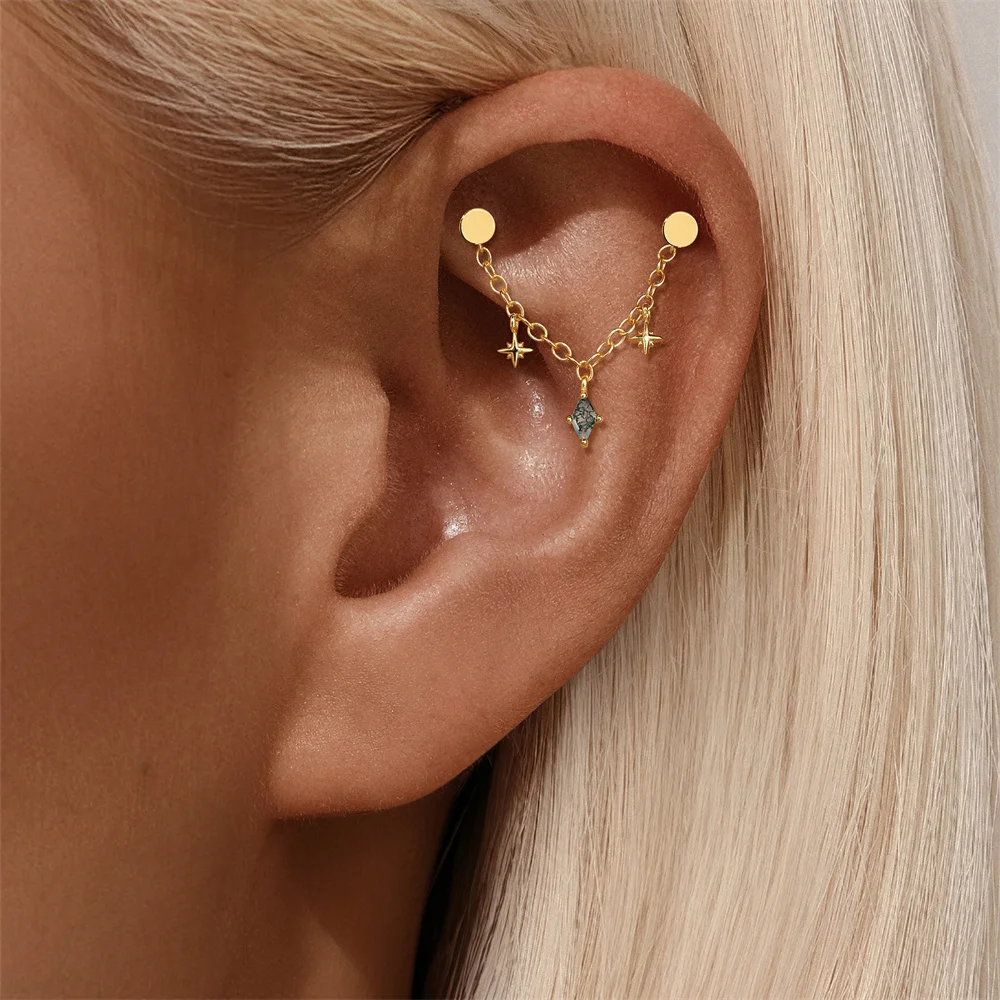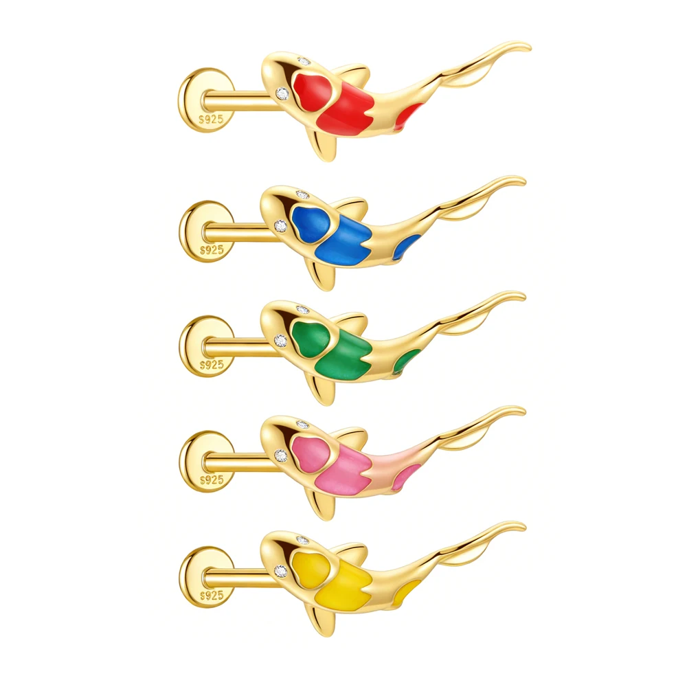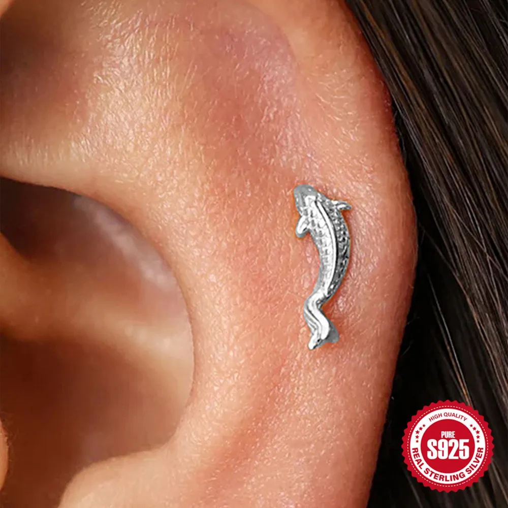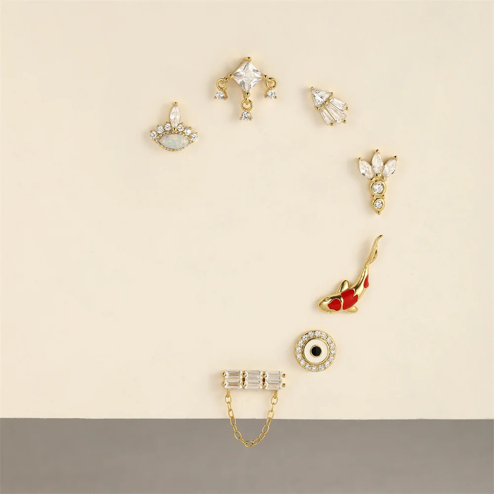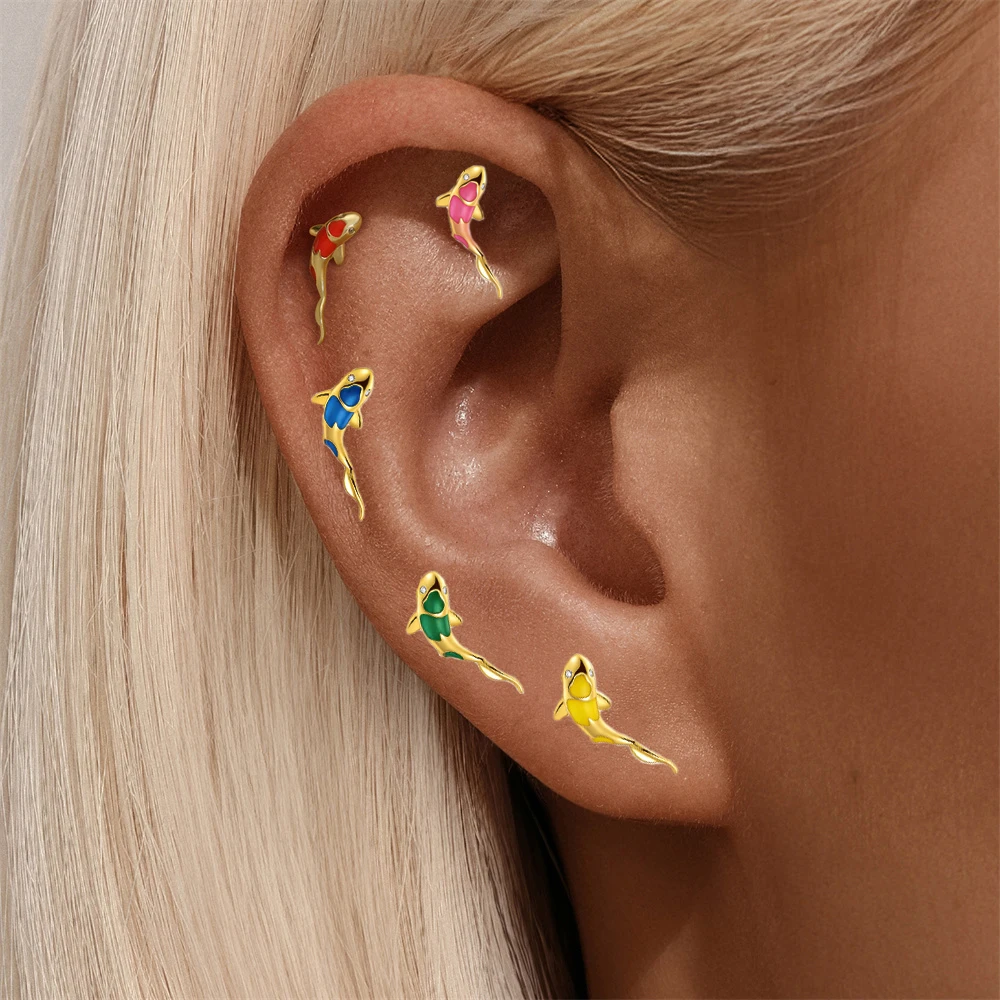 AIDE 1PC 925 Sterling Silver Lucky Red Koi Piercing Earring For Women Geometric Chain Zircon Ear Bone Stud Earrings Fine Jewelry