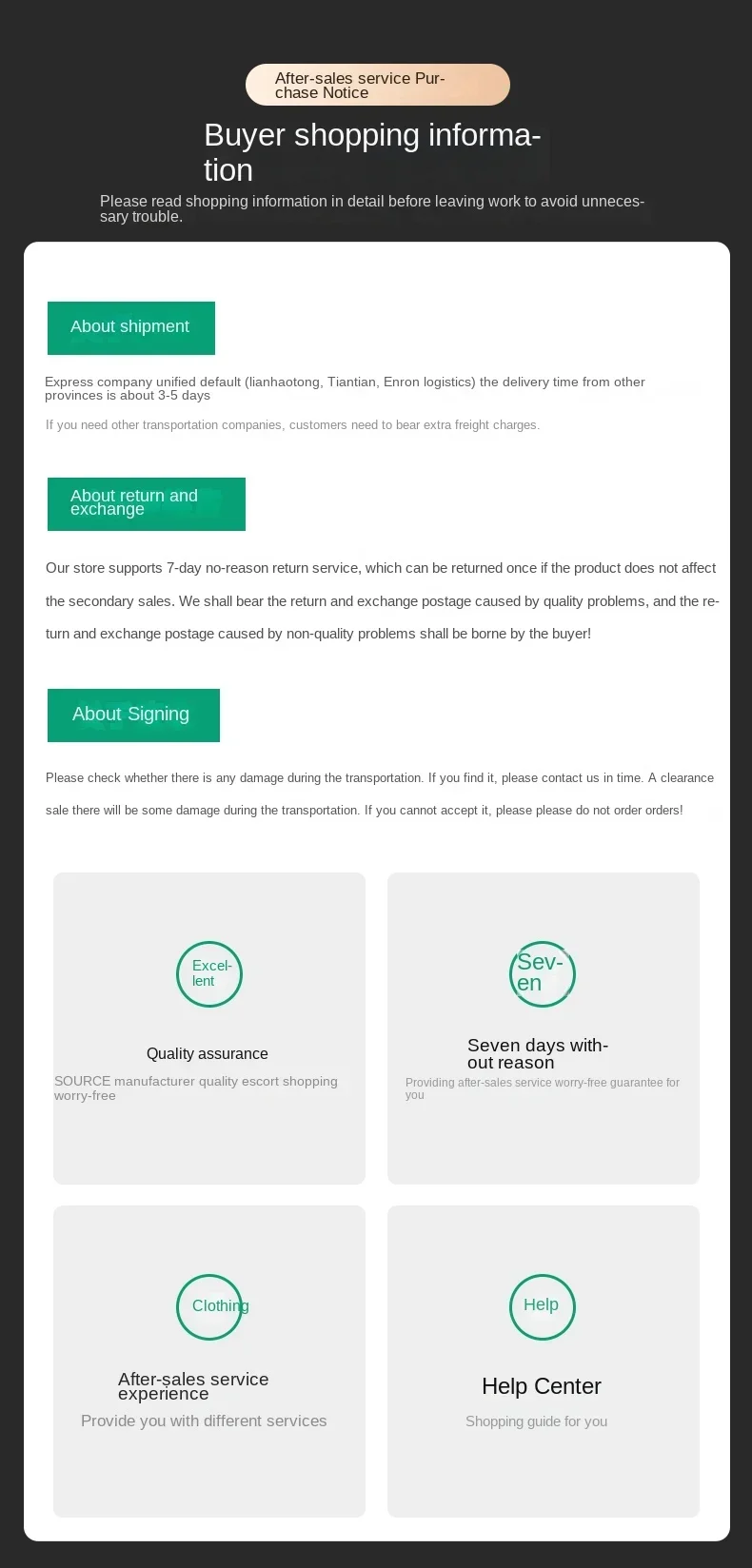 1.We offer the 1-month free replacement. Buyers may request for a replacement within 15 days from your receipt of the product. The buyer should return the product in the original conditions to us and should bear the shipping costs for return.