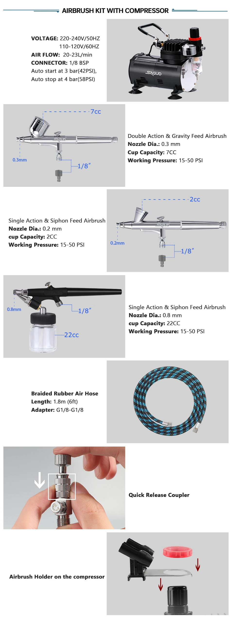 SAGUD Air Compressor Airbrush Kit with 3 Professional Airbrush Sets 0.2/0.3mm Gravity & 0.8mm Siphon Feed for Painting Cake Nail