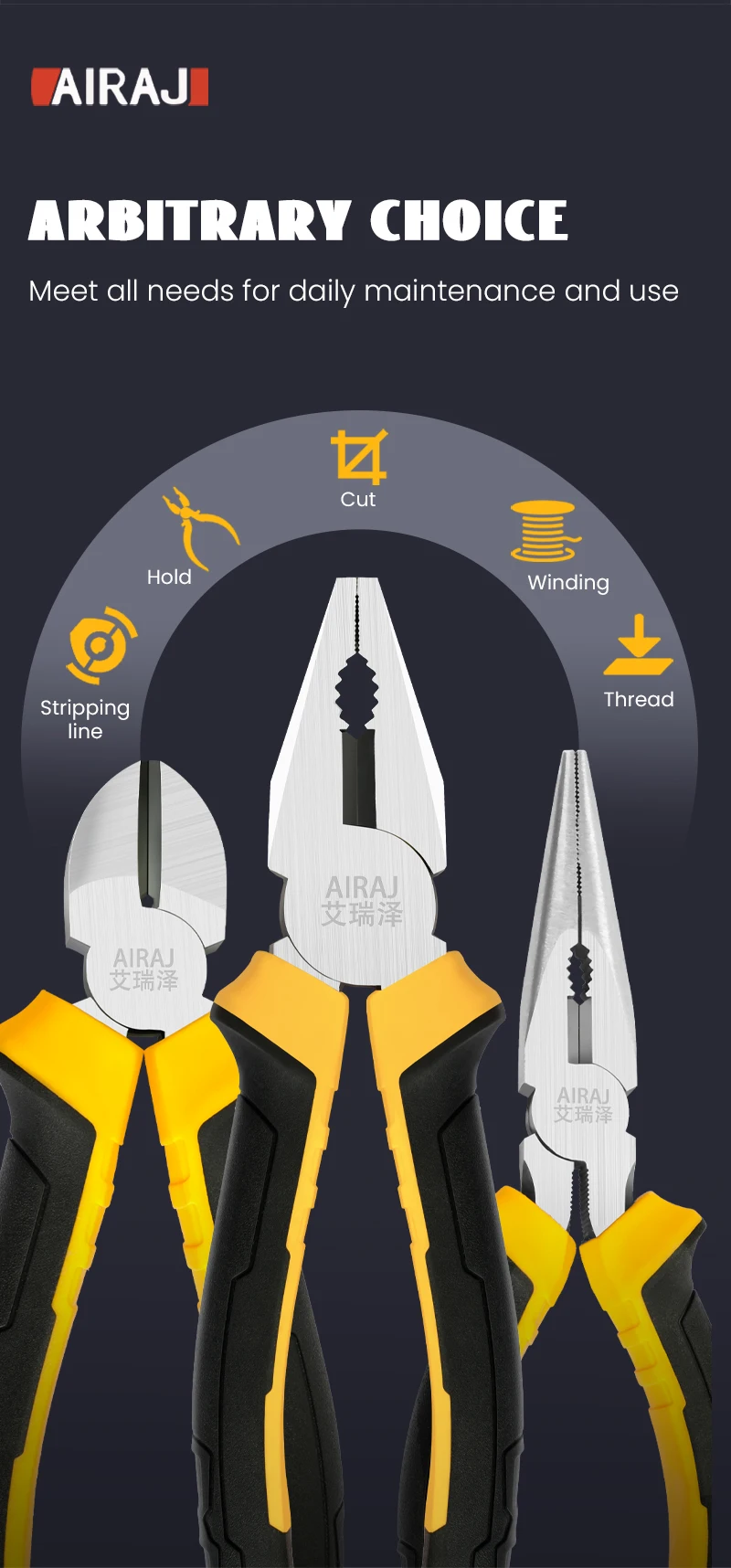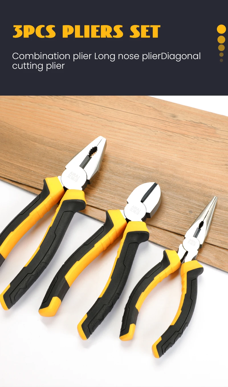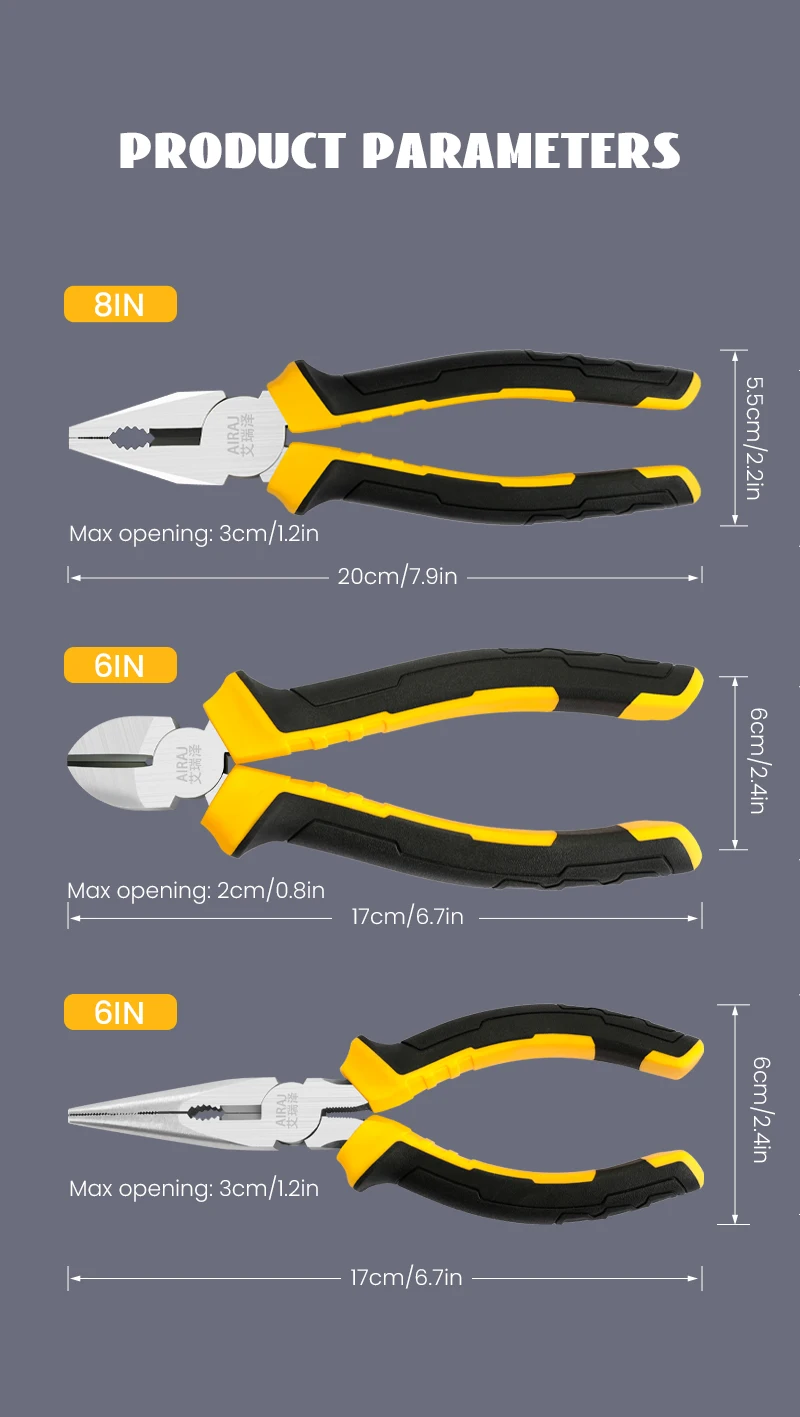 • Versatile Pliers Set :The AIRAJ plier set includes 8-inch wire pliers, 6-inch pointed nose pliers, and diagonal pliers, providing a variety of tools for your household needs.