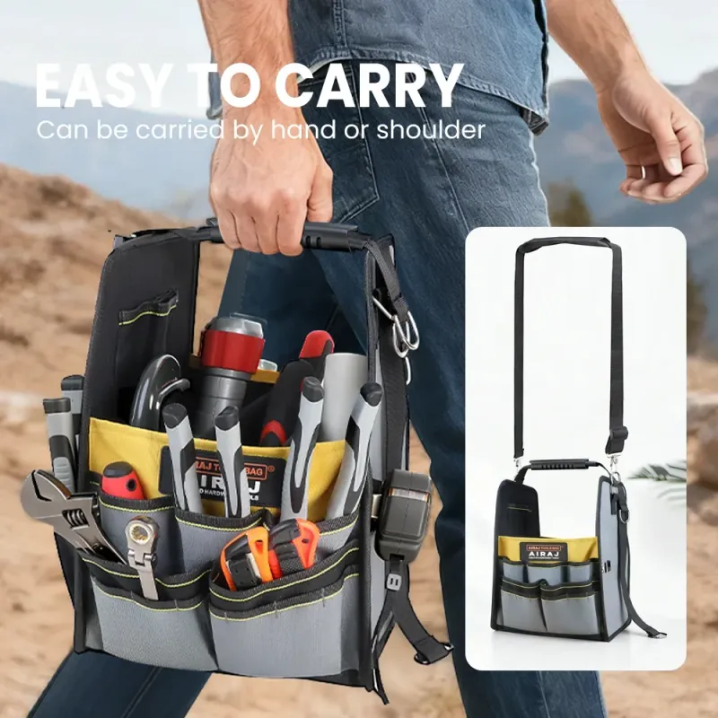 The AIRAJ Open Tool Bag is designed for practical storage and organization. It features adjustable straps for a customized fit. This tool tote comes with shoulder straps, making it portable and easy to carry. The bag includes multiple pockets, ensuring your tools are neatly stored and accessible. Ideal for professionals and DIY enthusiasts, this bag offers convenience and functionality.