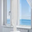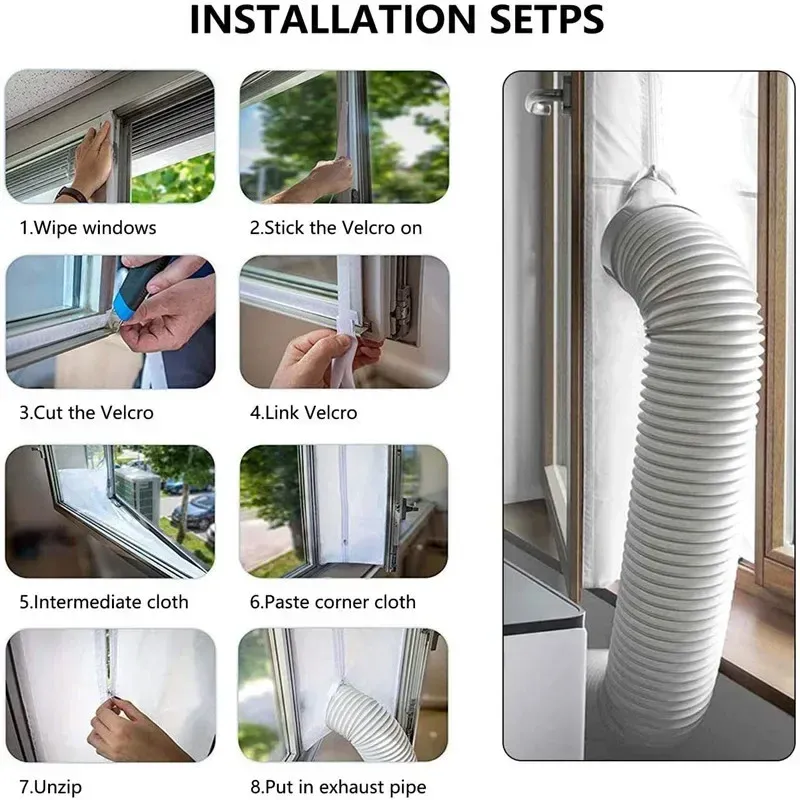Simply apply the adhesive hook tape to the inside of your window frame and to the window itself. Attach the window seal to the hook tape. Then, open the zip on the window seal and place your air conditioner hose out of the window. At the end, close the zip tightly around the hose.