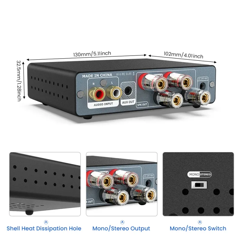 Working Voltage:DC 24-48VPower Supply: 32V/5A, 36V/6A ,48V5A,48V 10A (R+ connect to speaker +, L+ connect to speaker -)
