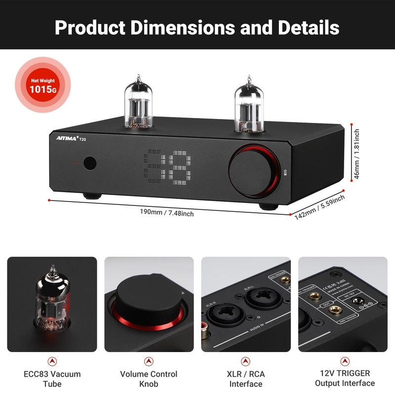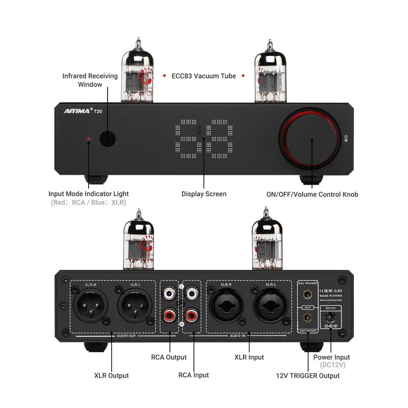 AIYIMA T20 Vacuum Tube Preamplifier ECC83 Fully balanced Preamp RCA XLR Input HiFi Stereo DAC AMP 12V Trigger output