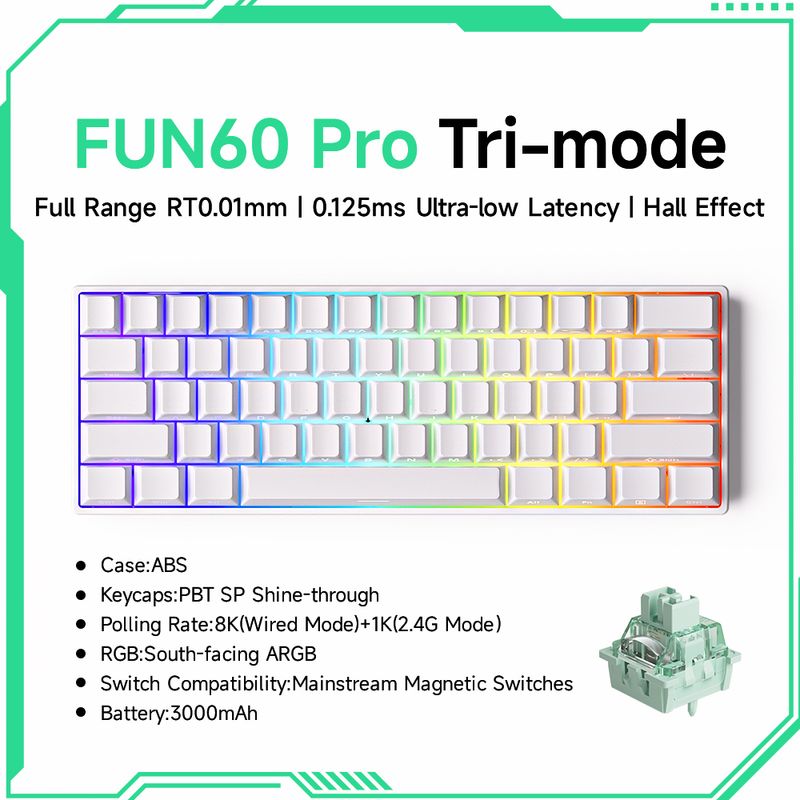 FUN60 Pro & Max Tri-mode Series features a 60% layout and is equipped with a 3000mAh built-in battery, providing extended, uninterrupted typing, gaming, or productivity without the need for frequent recharging.
