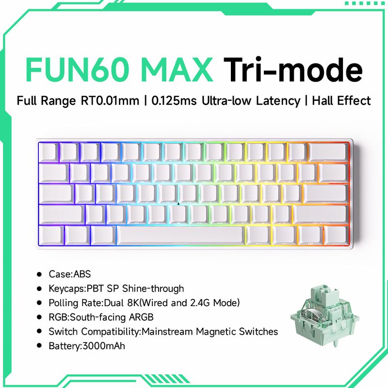 FUN60 Pro & Max Tri-mode Series features a 60% layout and is equipped with a 3000mAh built-in battery, providing extended, uninterrupted typing, gaming, or productivity without the need for frequent recharging.