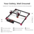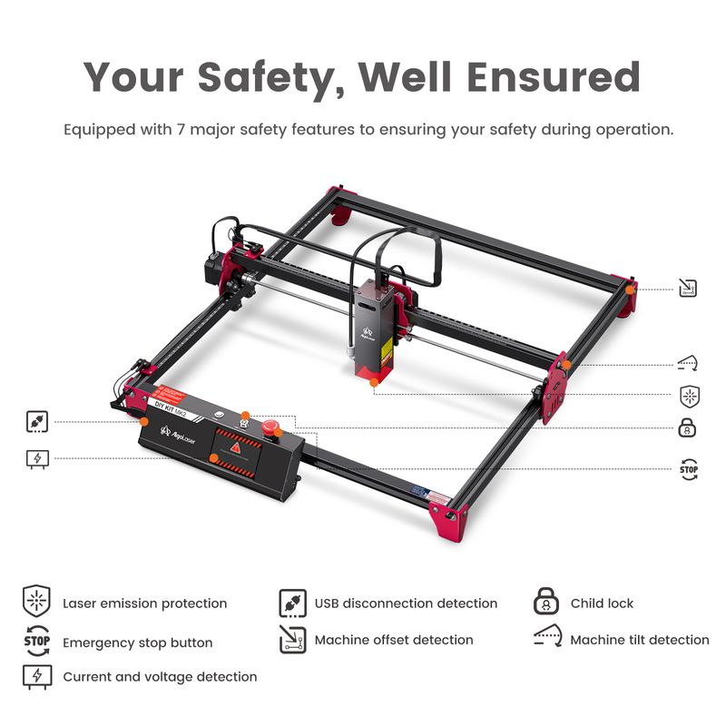 Move Protection & Thermal Protection & Eye Protecting - If the machine is moved while in use will initiate auto-shutdown for personal safety. Thermal protection initiates an auto-shutdown if it detects a flame or the engraving area overheats. An acrylic cover on the laser module, which can protect your eyes. It has extra Emergency Stop Button /Safety Lock safety functions than other brands.