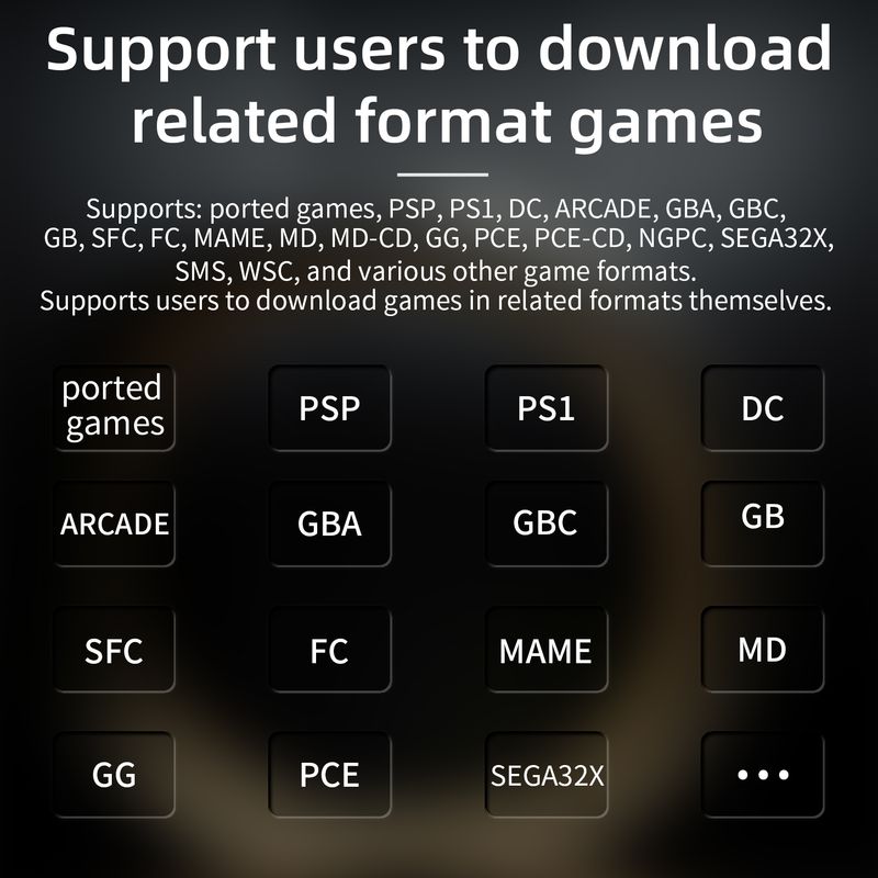 Games: Supports: ported games, PSP, PS1, DC, ARCADE, GBA, GBC, GB, SFC, FC, MAME, MD, MD-CD, GG, PCE, PCE-CD, NGPC, sega32x, SMS, WSC, and various other game formats. Supports users to download games in related formats themselves.
