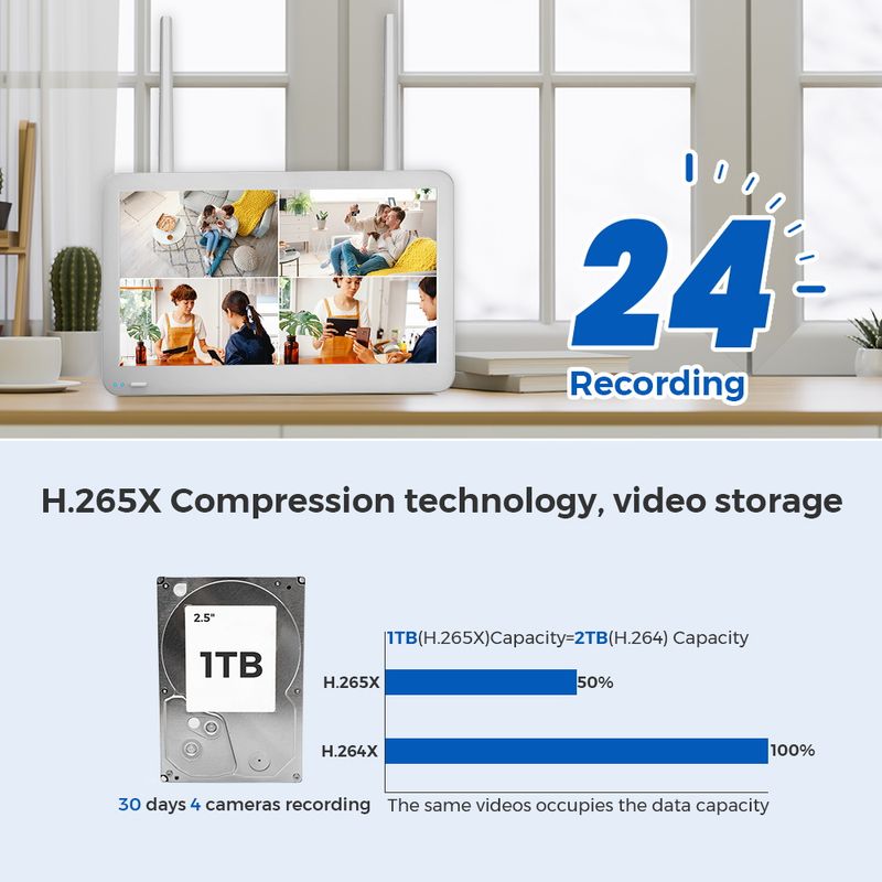 Hard disk is necessary for video recording ,thanks to the H.265 High Efficiency Video Coding Technology ,the 1TB Hard disk enables to continuous record about 30 days video footage for 4 cameras 500G can record about 15 days for 4 cameras