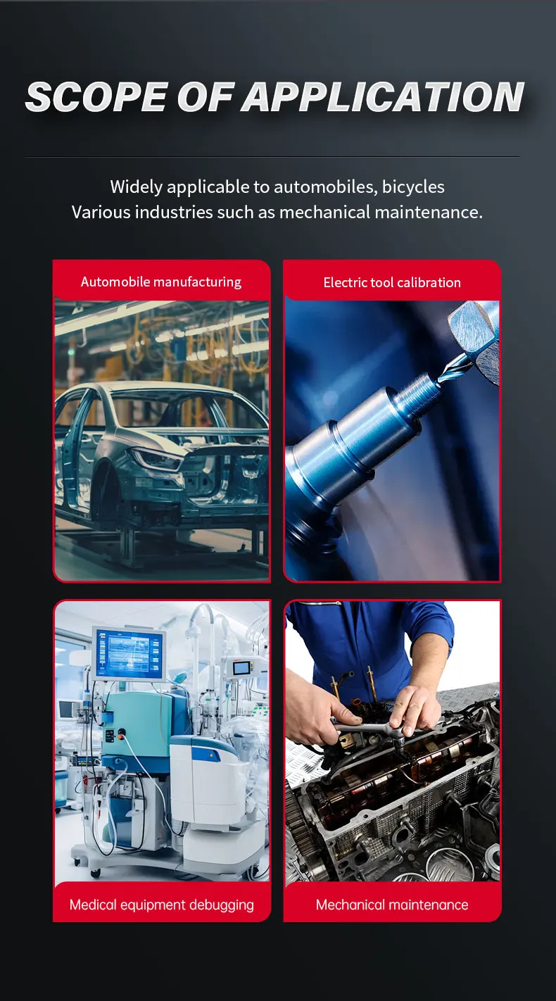 Digital torque meter is a torque monitoring instrument with ratchet hand, which is used for all kinds of fastening and disassembly control. it has the functions of simple operation, easy to carry, multi-unit conversion, sound indication, adjustable forward and reverse, etc., which is widely used in automobile, bicycle, all kinds of mechanical maintenance and other industries.
