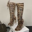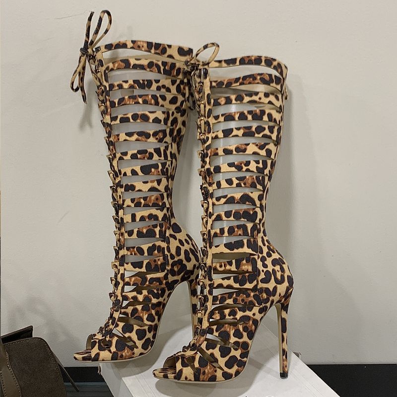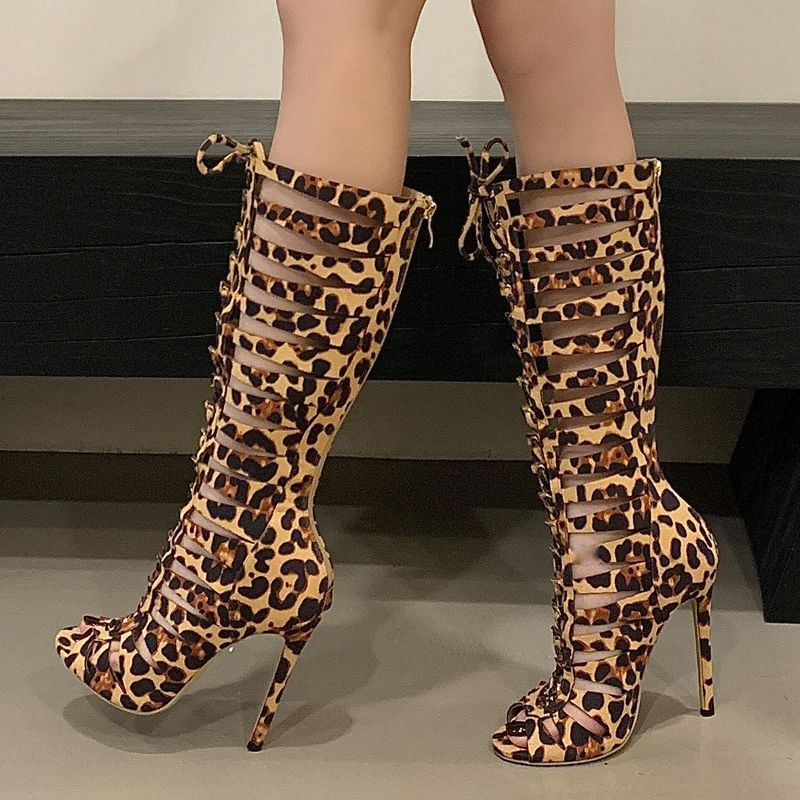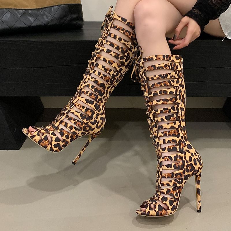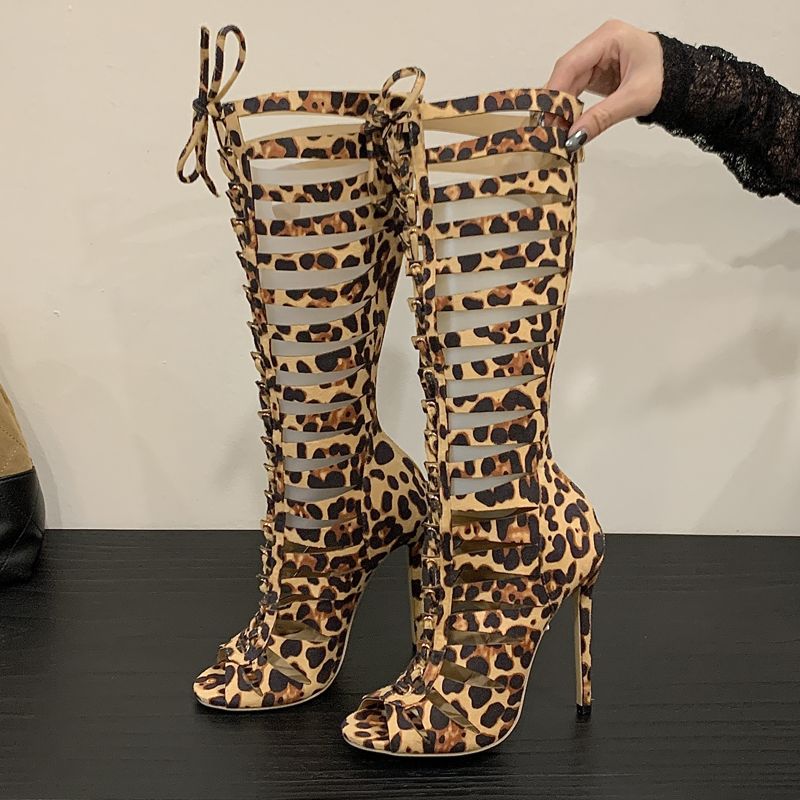 Aneikeh Fashion Hollow Out Leopard Print Designer Peep Toe Women Boots Sandals Zipper Thin High Heels Rome Style Female Shoes