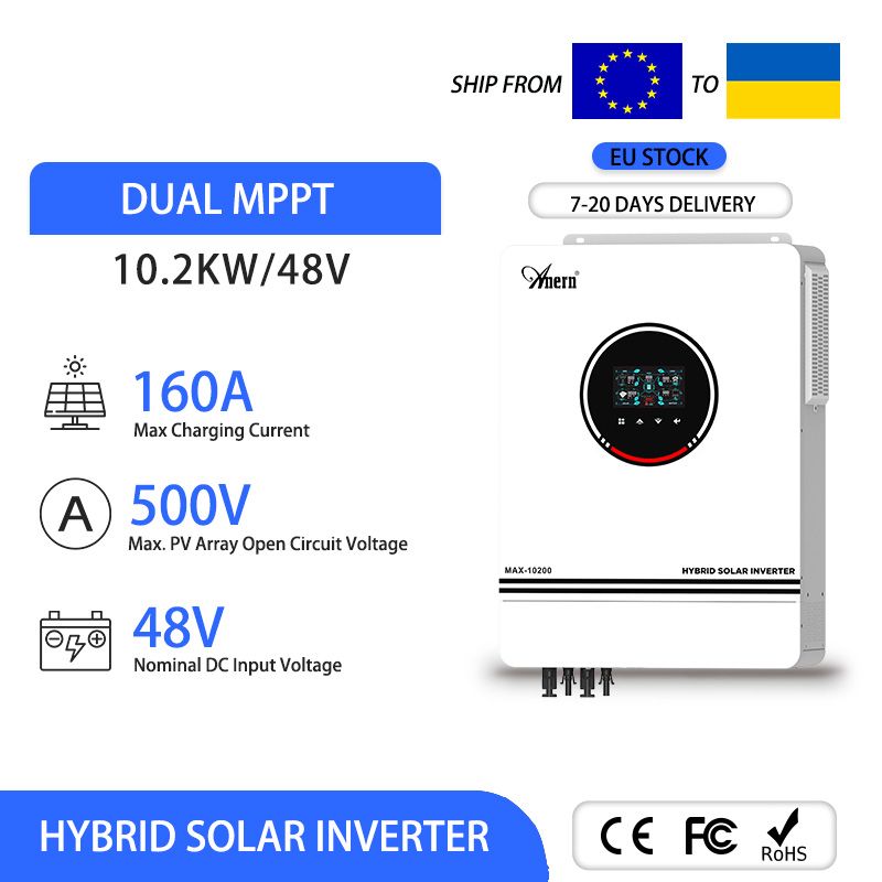 Anern Off Grid Solar Inverter 1KW 1.6KW 3KW 6.2KW MPPT 80A 120A 230V Hybrid Inverter 12V 24V 48V MAX PV 150Vdc 400Vdc 500Vdc