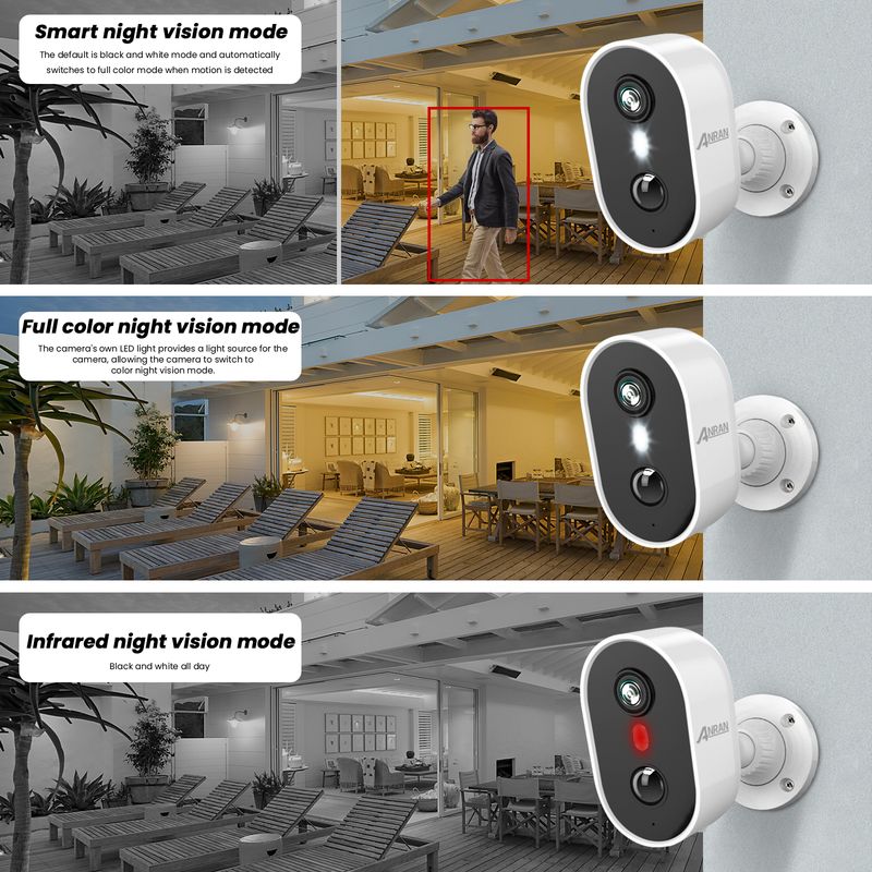 Three night vision modes provide a variety of options. In smart night vision mode, the camera can automatically switch to full color or black and white mode based on whether motion is detected.