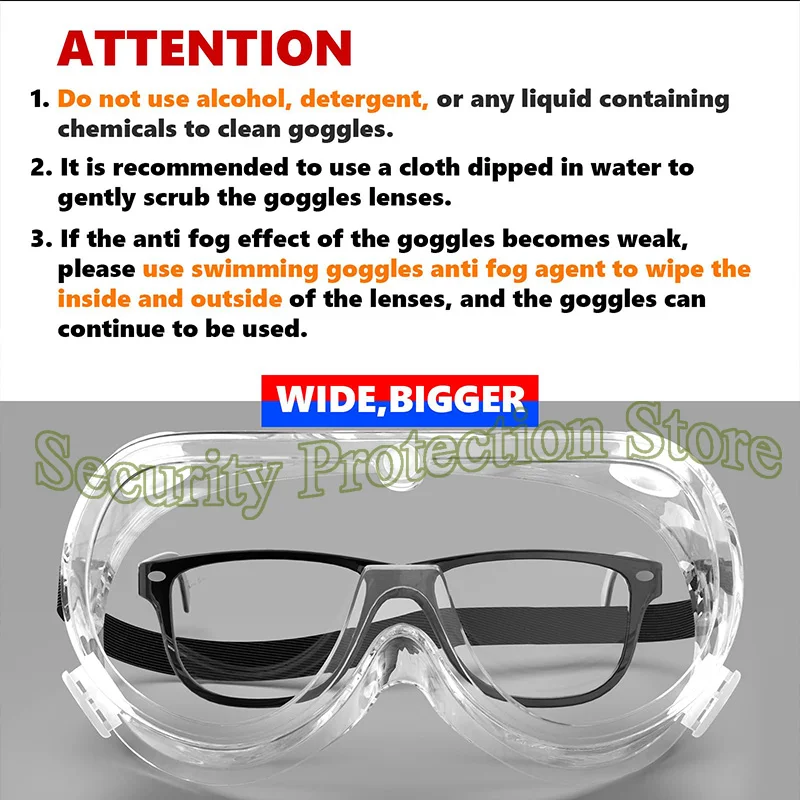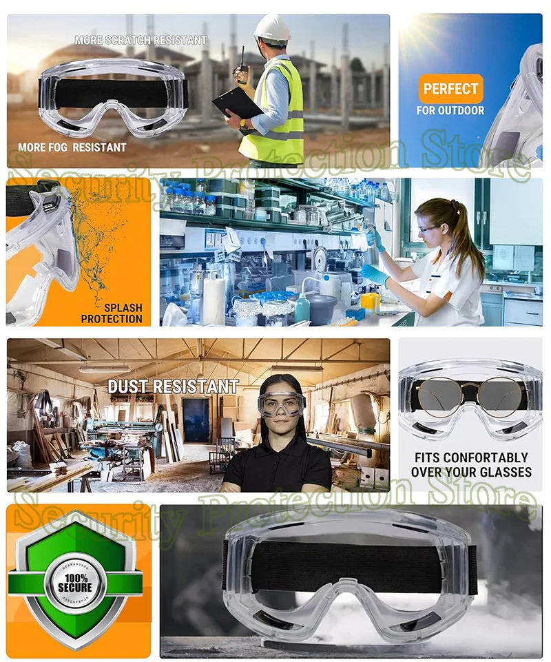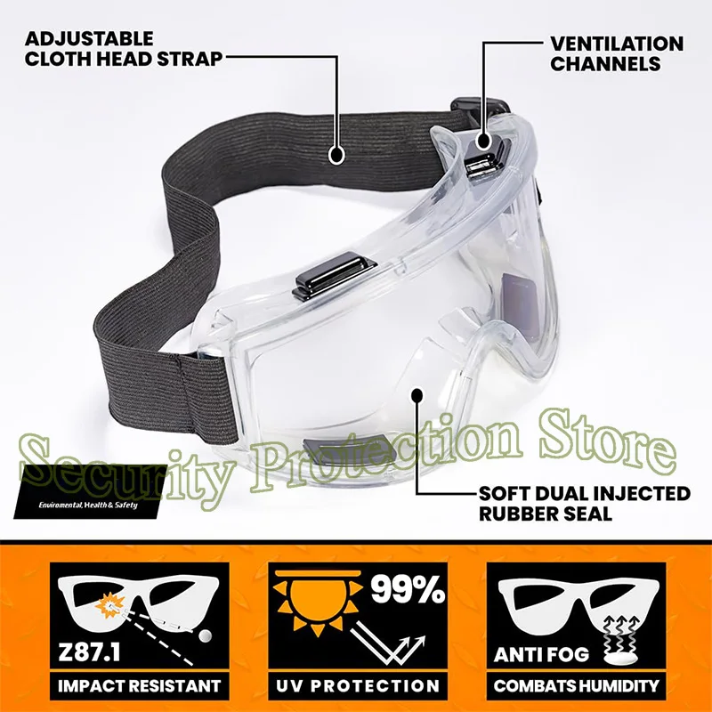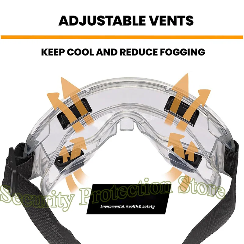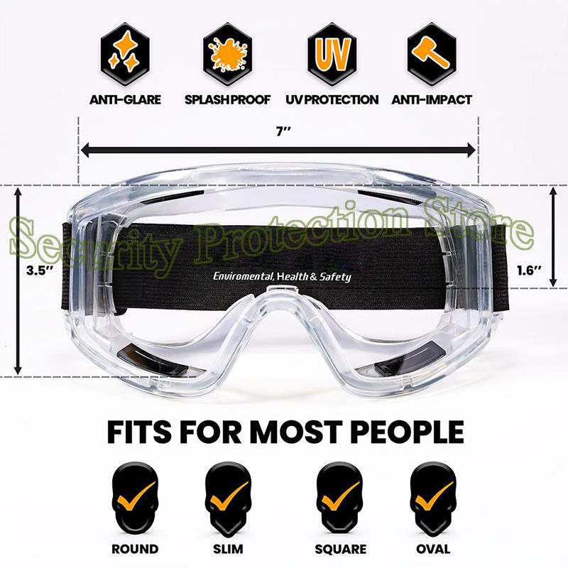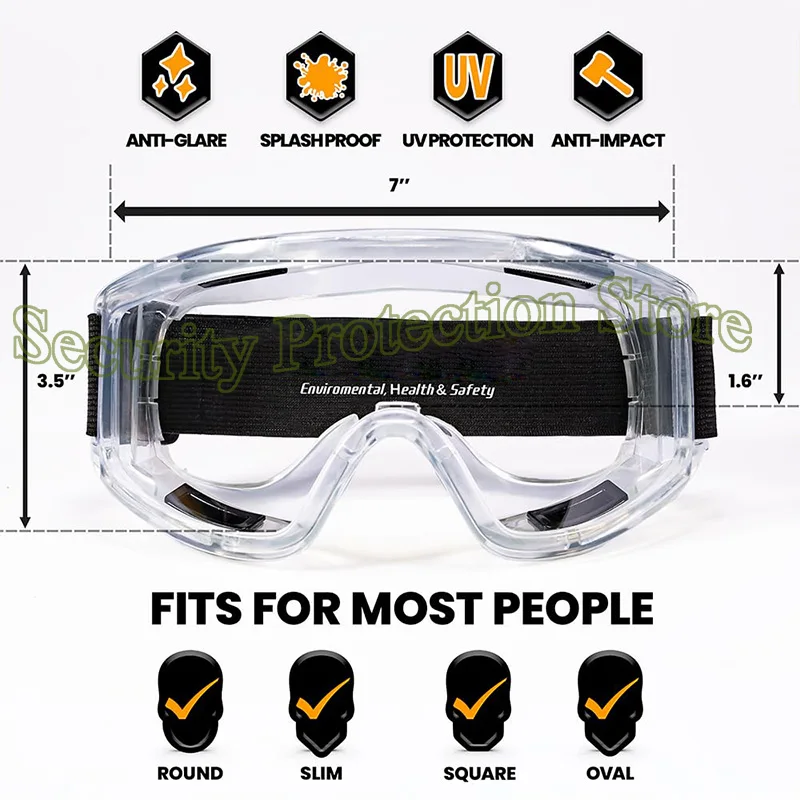ăCOMFORTABLE FITă The soft PVC frame and adjustable elastic headband ensure a secure yet comfortable fit for extended wear in healthcare, construction, or lab settings.