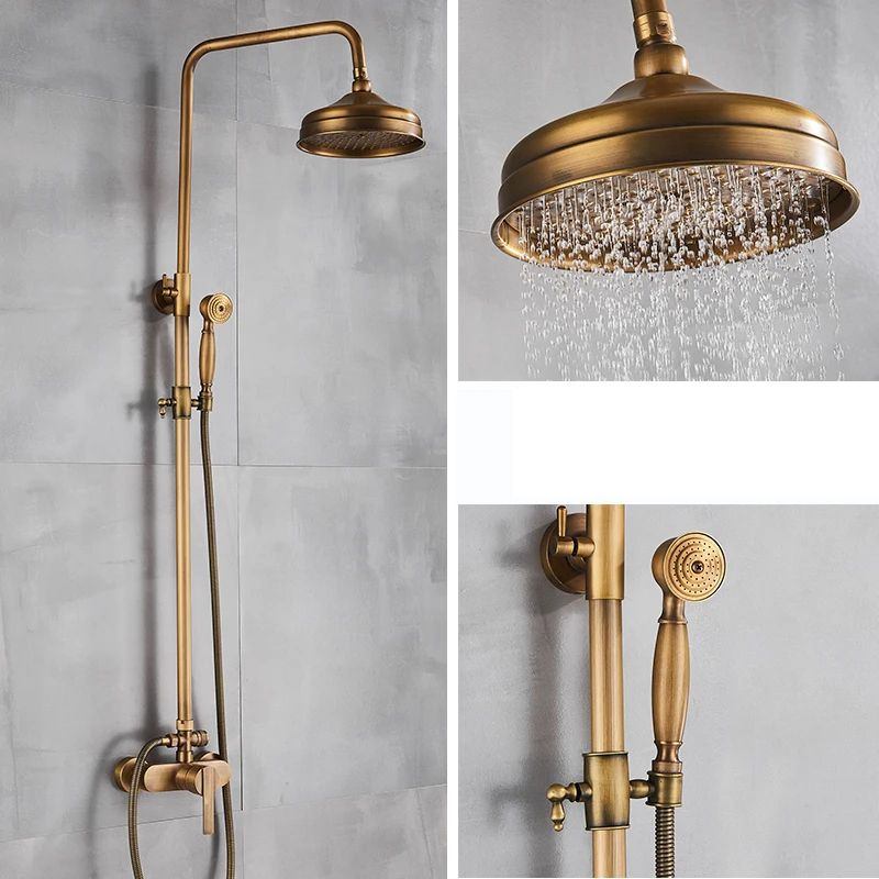 Antique Brass Shower Faucets Set 8'' Rainfall Shower Head Brass Handshower Dual Handle Mixer Tap Rotation Bath Shower Faucet