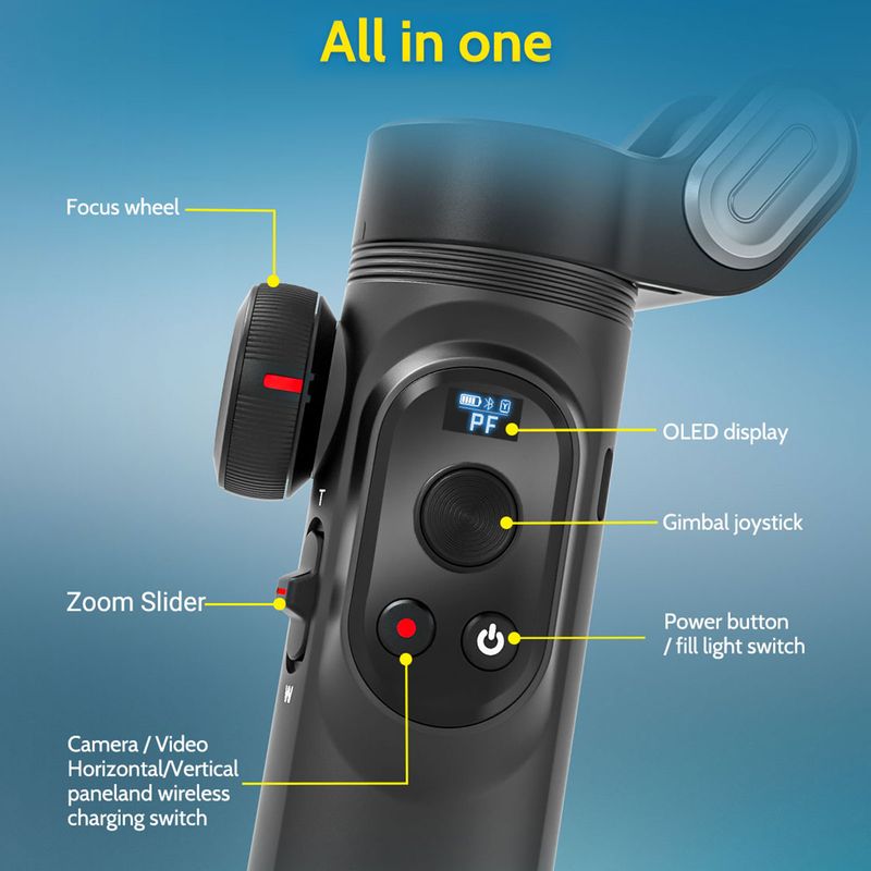 Shine your beauty with our integrated LED fill light. The Smart X Pro gimbal stabilizer with built-in video light and power button lights you up with three adjustable brightness levels. The LED fill light can illuminate up to 6000lux with 3 levels of brightness up to 5500k CCT. Even in dark lighting scenarios, nighttime shots are just as good.