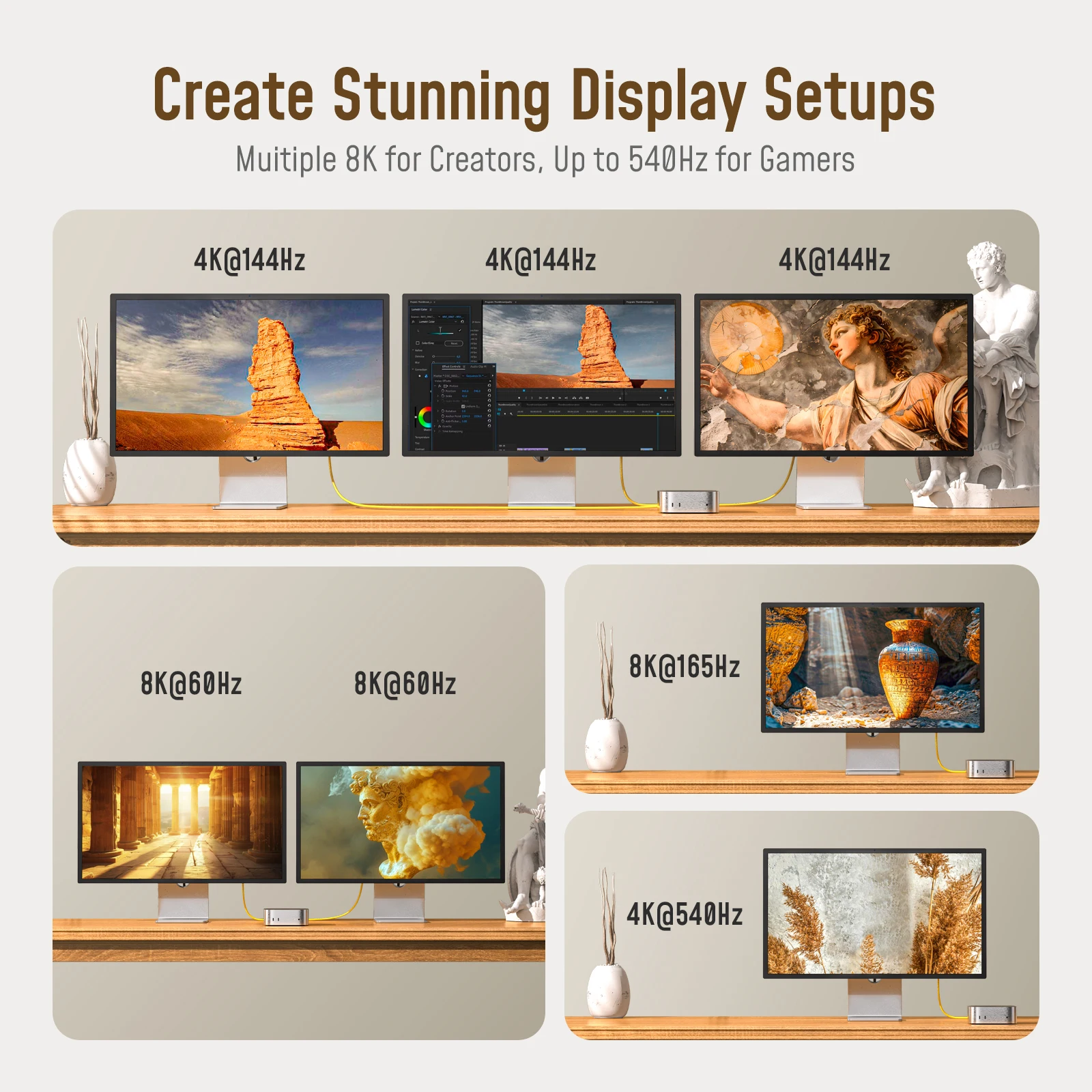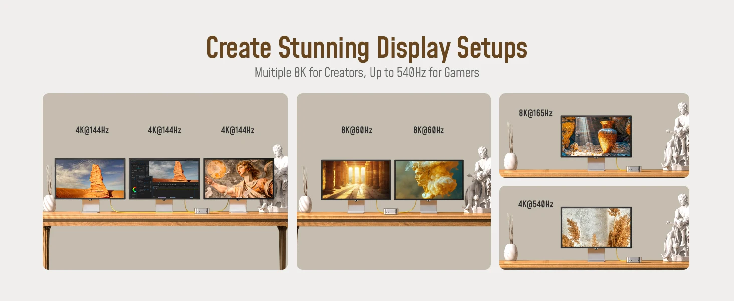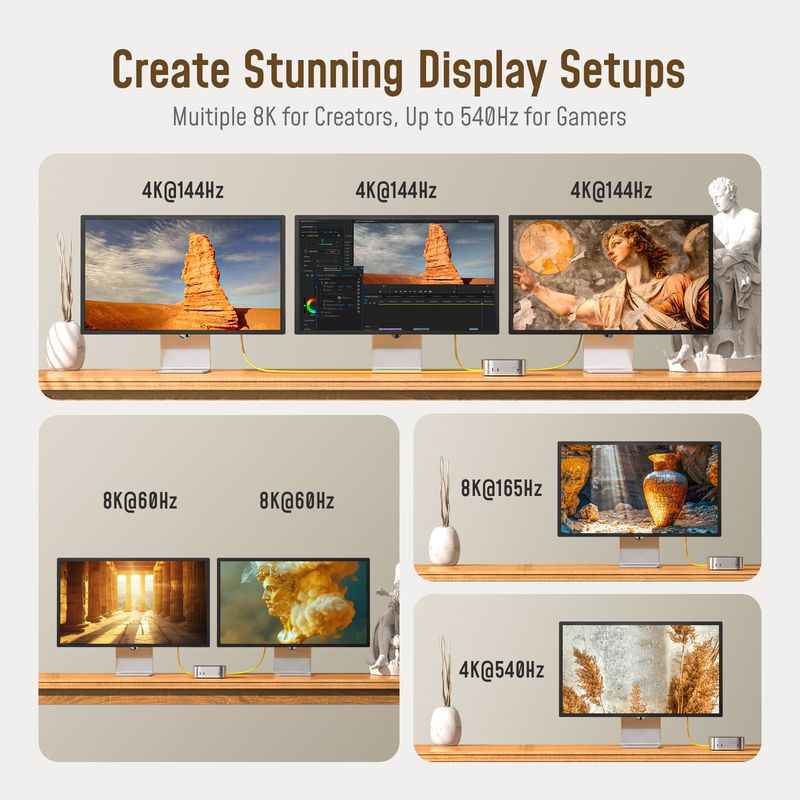 Enjoy dual 8K, dual 6K, or triple 4K @144Hz display support, ideal for graphic design, video editing, and high-resolution content creation. Effortlessly handle high-res videos and intricate 3D models with ultra-smooth performance, reduced delays, and maximized productivity.