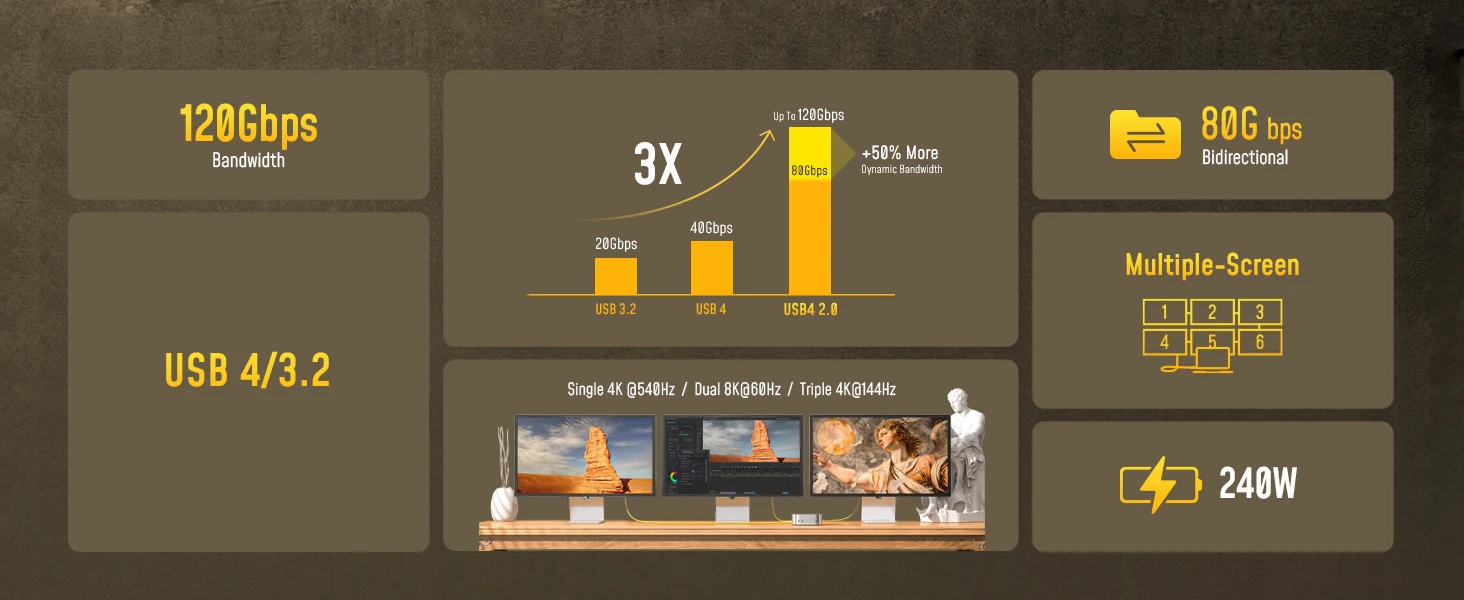 This 80Gbps USB 4 cable supports a single 8K@165Hz/4K@540Hz display, dual 8K@60Hz displays, or triple 4K@144Hz displays, and is compatible with DP2.1 and multi-display daisy-chaining. It delivers clear details and ultra-high-definition video quality, meeting the high demands of professional design, video editing, gaming, and more, helping to build a powerful workstation
