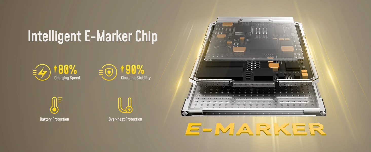 Supporting the latest PD 3.1 technology and up to 240W Power Delivery, this 240w USB C cable charges laptops, smartphones, and other USB-C devices at peak speed, reducing downtime and maximizing productivity. Equipped with an E-Marker chip for safety and stability, it provides fast charging and excellent data and video performance, all while reducing cable clutter