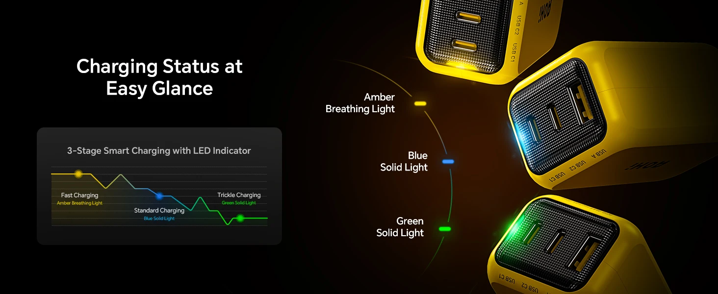 AOHI’s exclusive smart LED charging indicator shows real-time status: Amber: Fast Charging; Blue: Standard Charging; Green: Trickle Charging. It also features intelligent power regulation to ensure safety and device longevity.