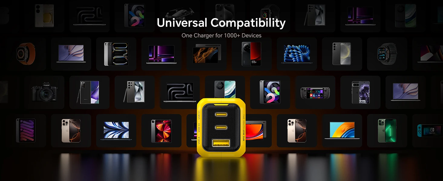 Equipped with the latest 65W PD/PPS protocols and GaN technology, it delivers high-efficiency fast charging for over 1,000 devices, including MacBook Air M3 (0–51% in 30 minutes), iPhones, Android phones, tablets, and ultrabooks.