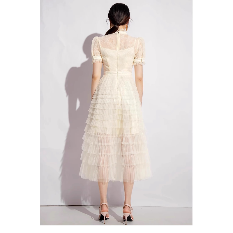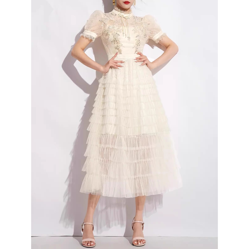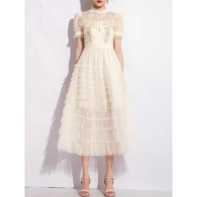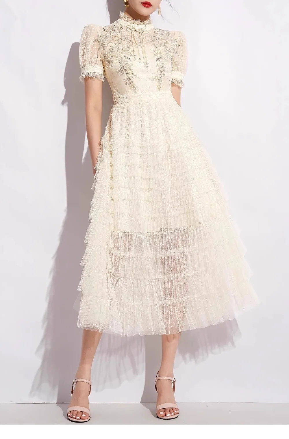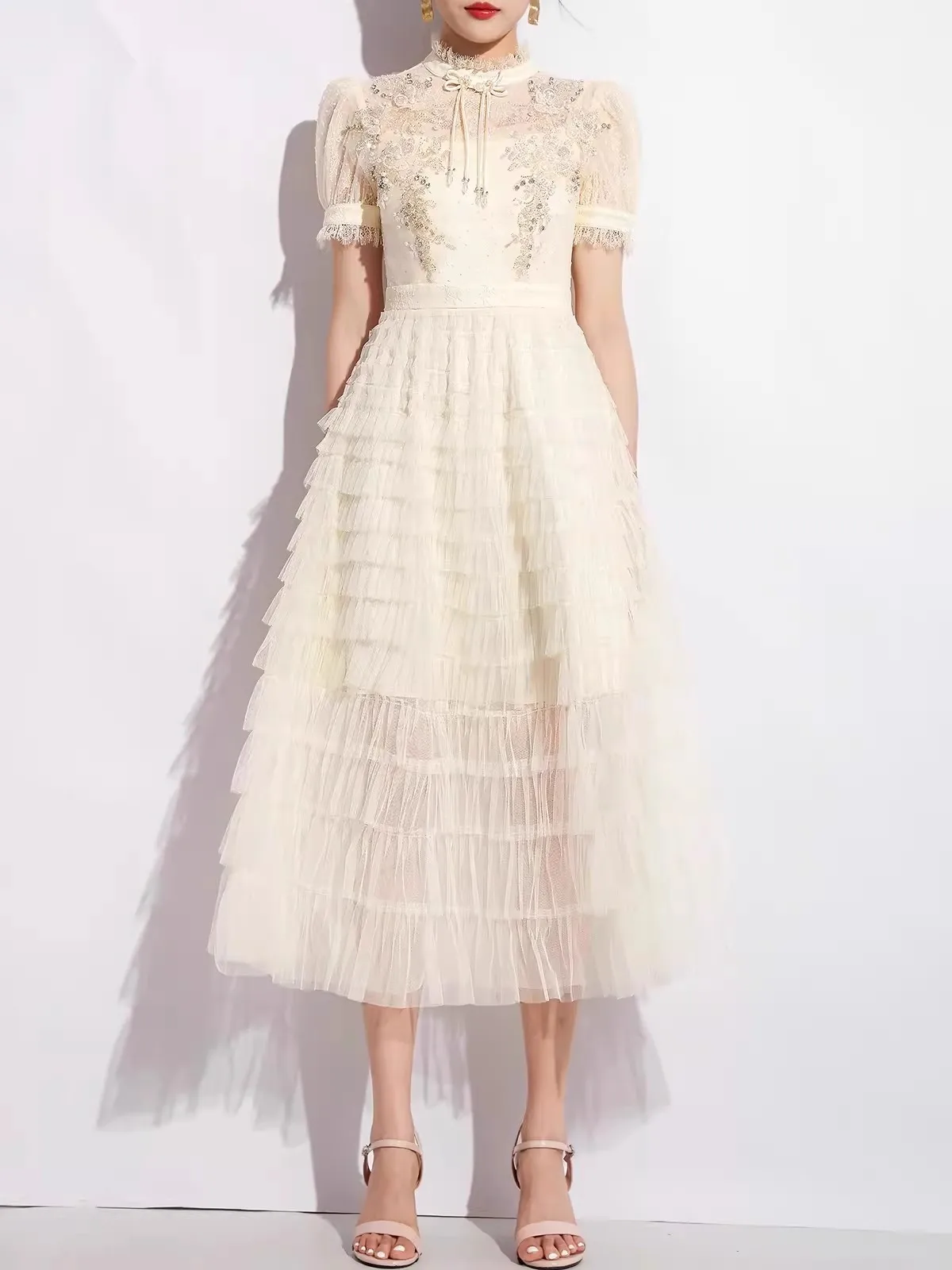 Apricot Elegant Tiered Dress Women Beading Lace Patchwork Streetwear Vestidos O-neck Runway Design Holiday Party Clothing Lady