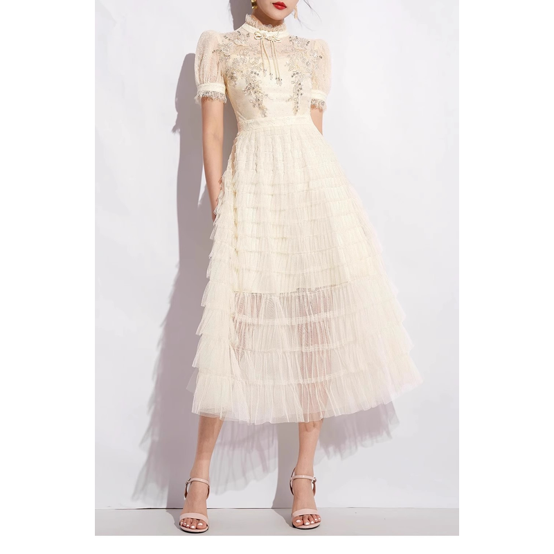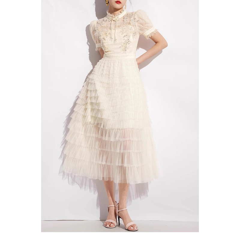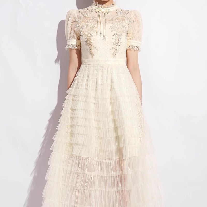 Apricot Elegant Tiered Dress Women Beading Lace Patchwork Streetwear Vestidos O-neck Runway Design Holiday Party Clothing Lady