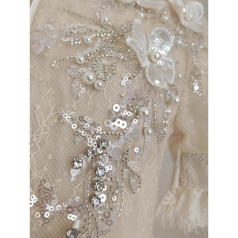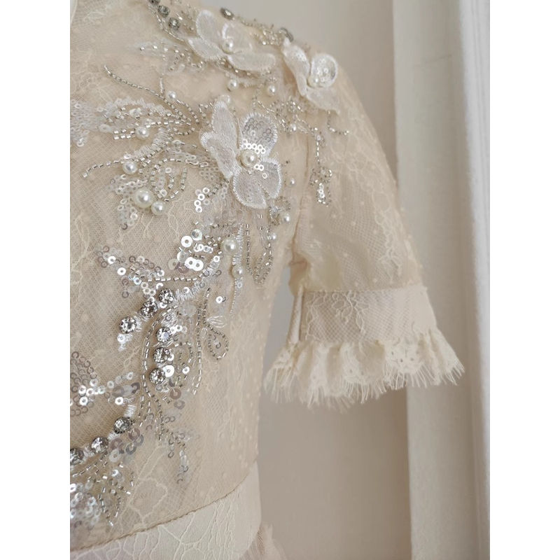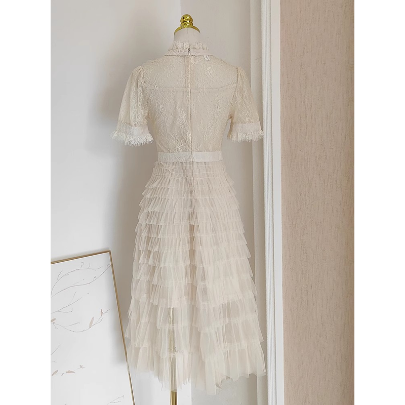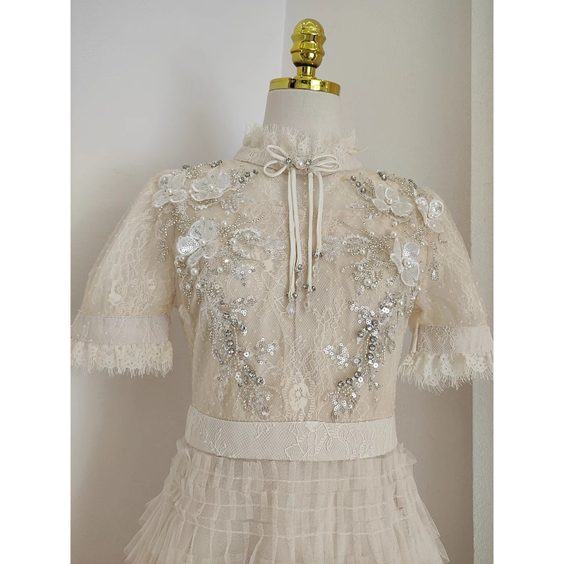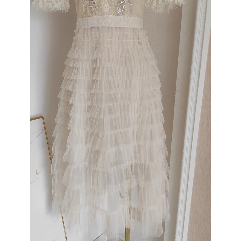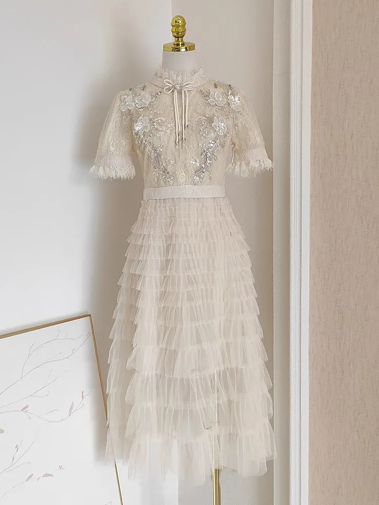 Apricot Elegant Tiered Dress Women Beading Lace Patchwork Streetwear Vestidos O-neck Runway Design Holiday Party Clothing Lady