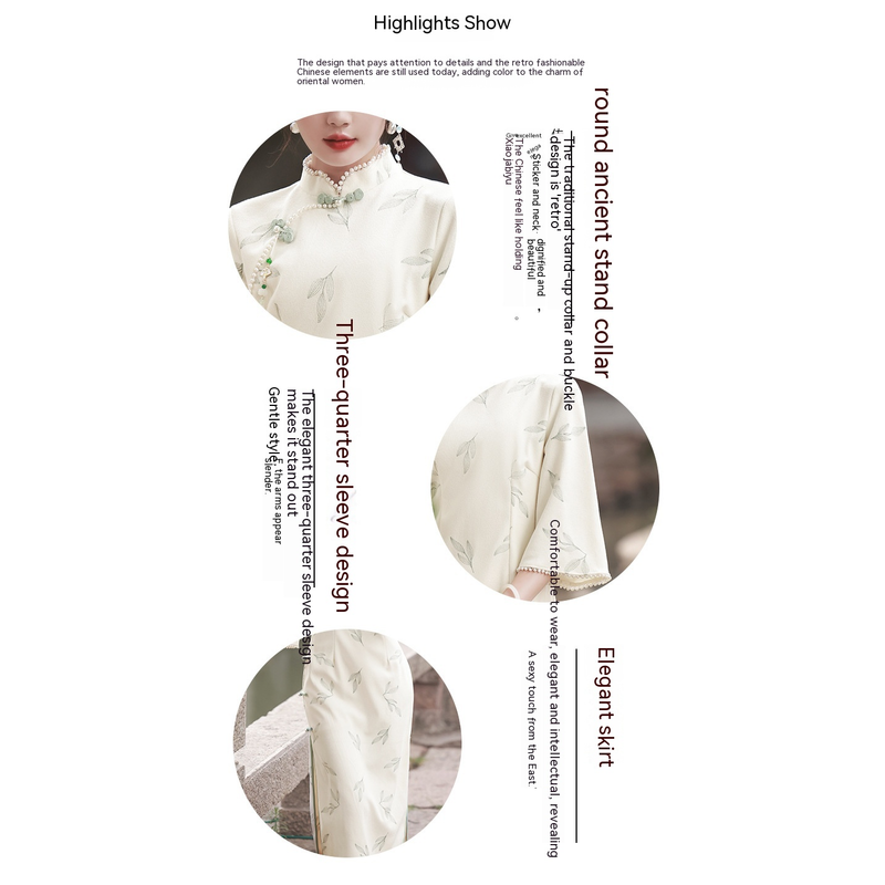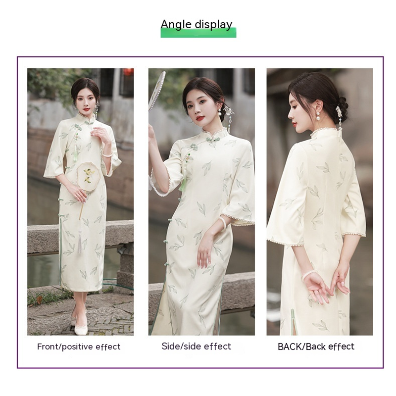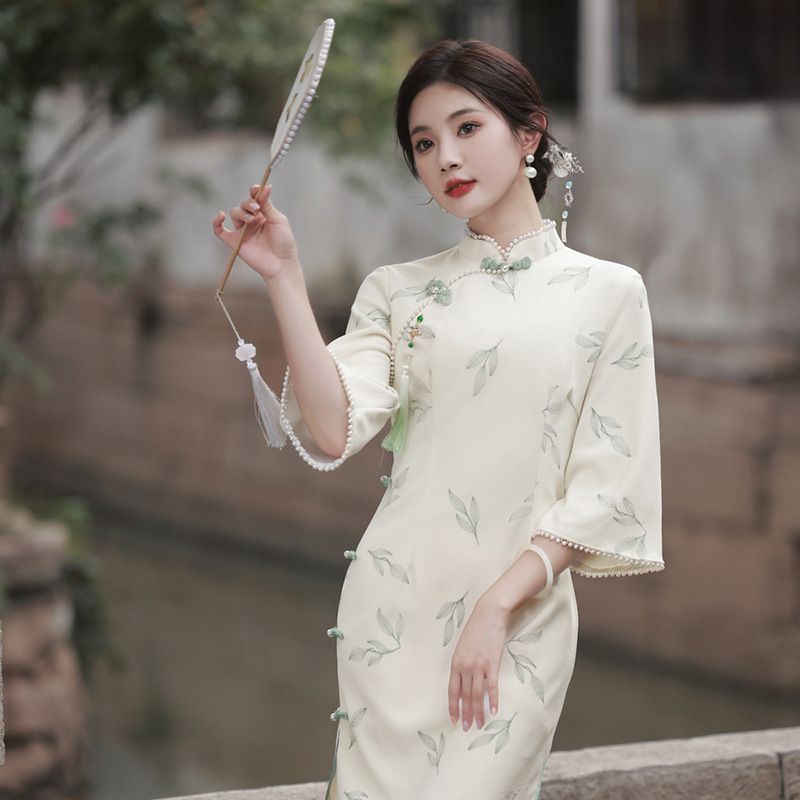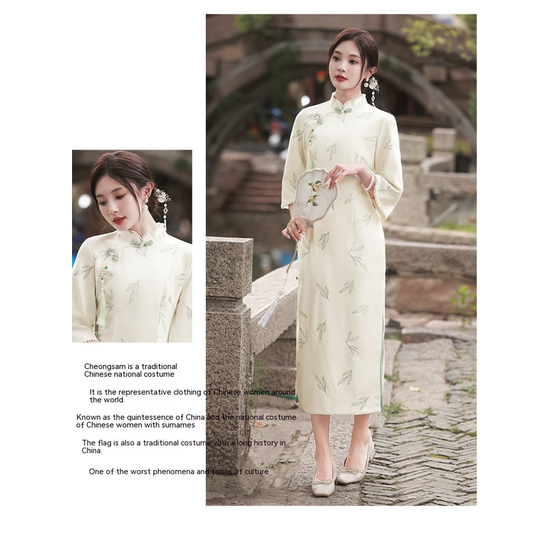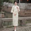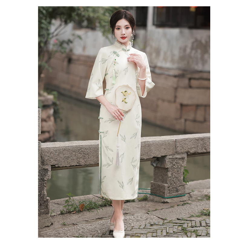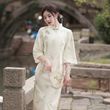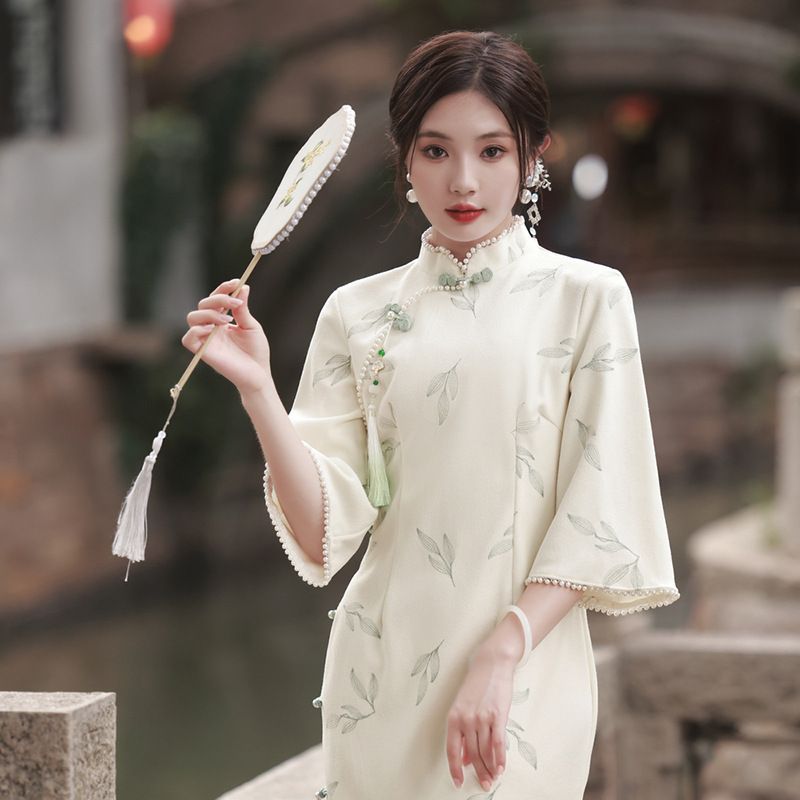 Apricot Lace Embroidery Bell Sleeve Dress Cheongsam 6702 Apricot S