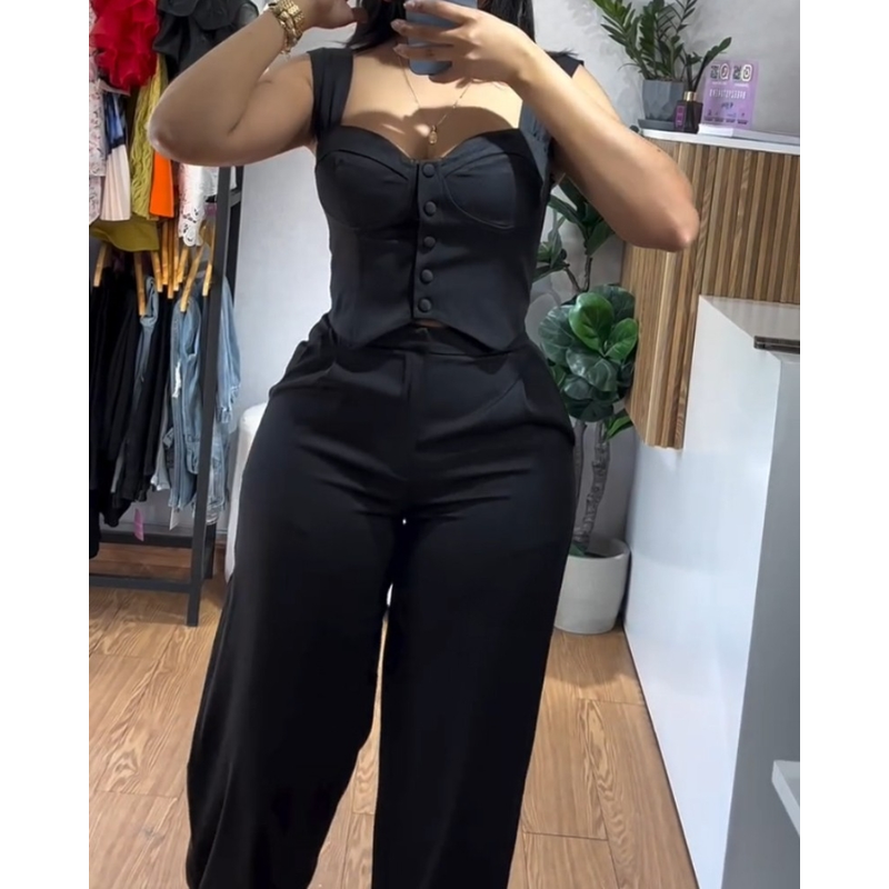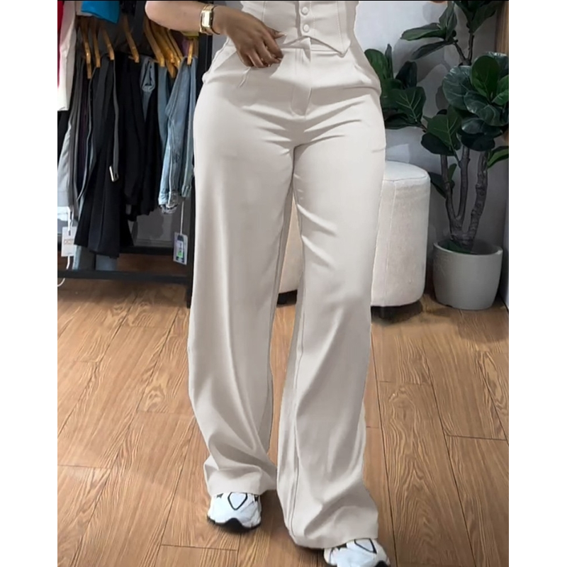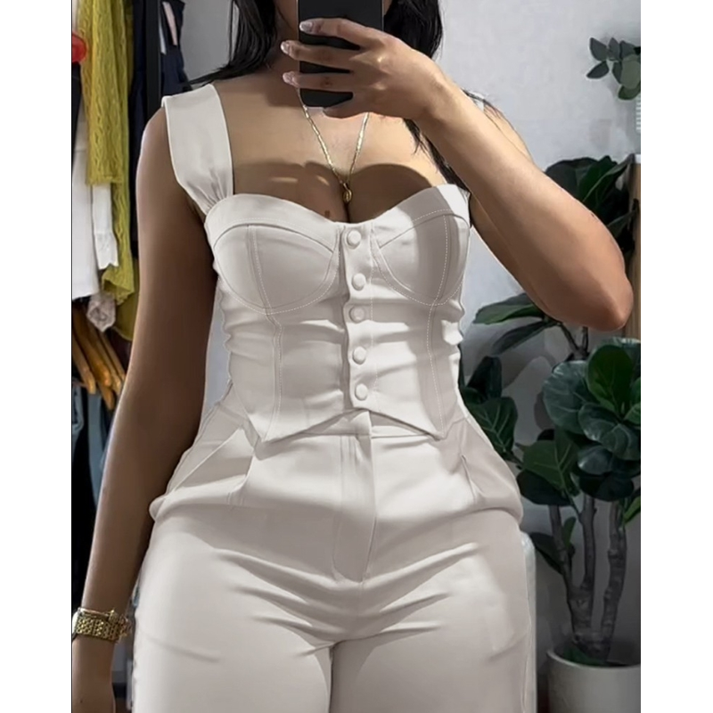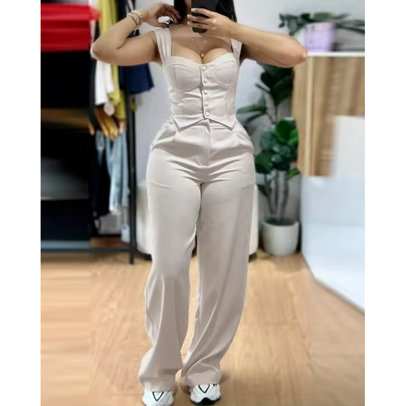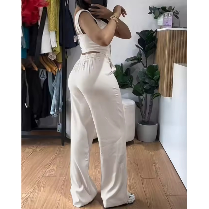 Apricot Sling Short Tight Vest Suit High Waist Wide Leg Trousers Apricot S