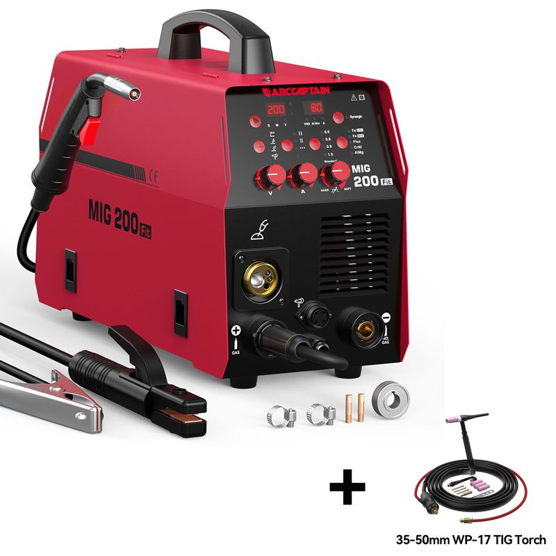 1.6 IN 1 Mutifunction Welding Machine: 220V 200A MIG Welding Machine For Gas MIG、Flux Core MIG、Lift TIG、MMA 、Spot Welding、Spool Gun MIG、can meet your different requirements.(Note:TIG torch WP-17V and Spool Gun need to be purchased separately) This welder machine perfectly ideal for home DIY, garage, outdoor repairs, rusty metal, farm and road equipment, and maintenance and repairs.