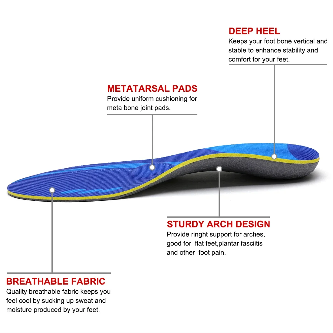 1. Lasting Comfort:Orthopedic insoles help relieve plantar fasciitis, flat feet, arch pain, tibial splints, excessive internal rotation, ankle pain, heel spurs, Morton neuroma, bunion inflammation, leg pain, knee pain and Lower back pain, correct abnormal walking.