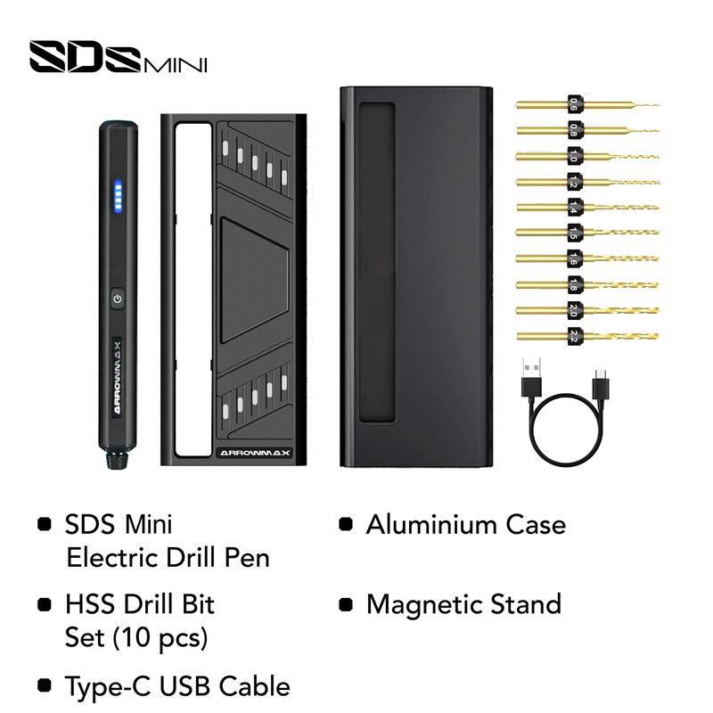 • Versatile Drill Bits: Includes 10 precision bits (0.6mm-2.2mm) with a universal 2.35mm shank. Effortlessly drills through plastic, wood, shells, and more—no tools needed for bit changes.