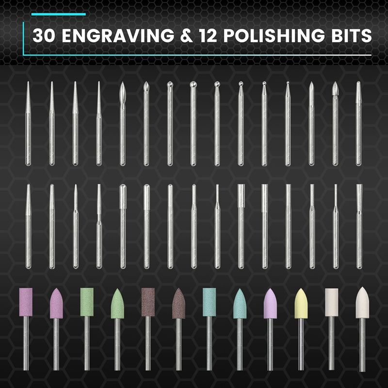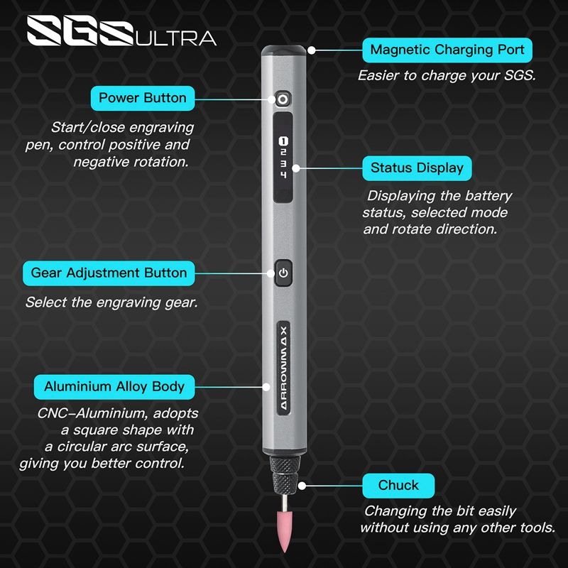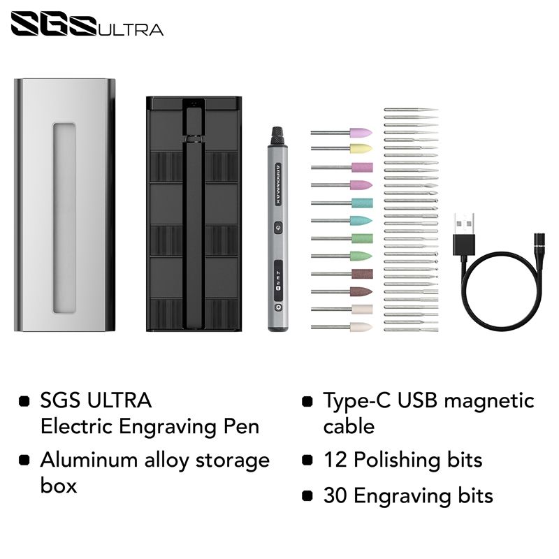 SGS ULTRA comes with aluminum alloy storagebox, which is convenient for storage and management of all accessories. Containing 12 polishing bits and 30 engraving bits. The parts are CNC precision machined, so that every work can be precise and agile!