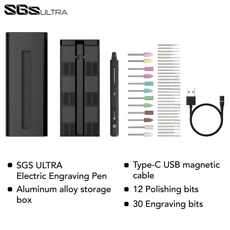 SGS ULTRA comes with aluminum alloy storagebox, which is convenient for storage and management of all accessories. Containing 12 polishing bits and 30 engraving bits. The parts are CNC precision machined, so that every work can be precise and agile!