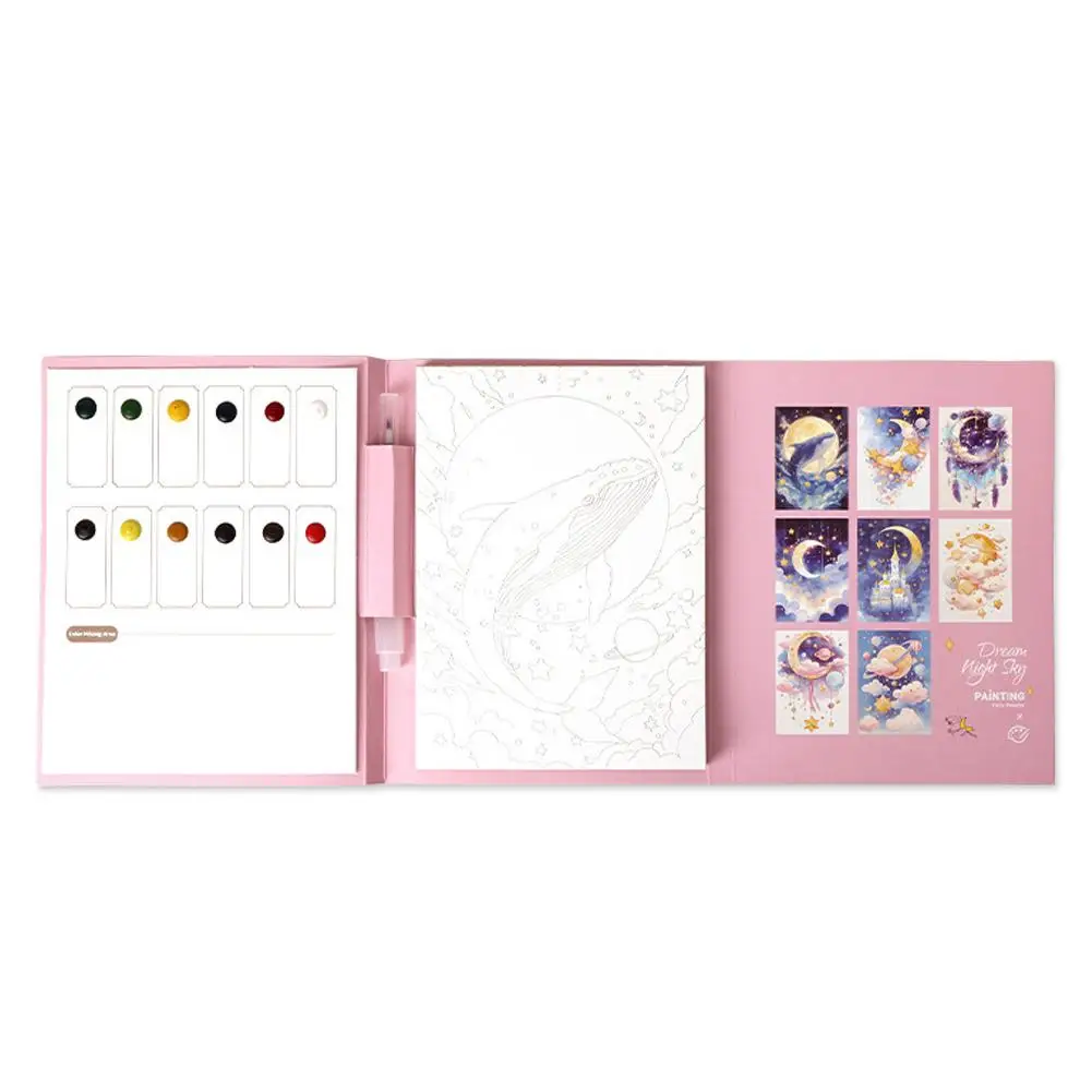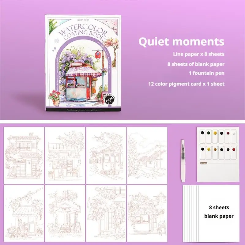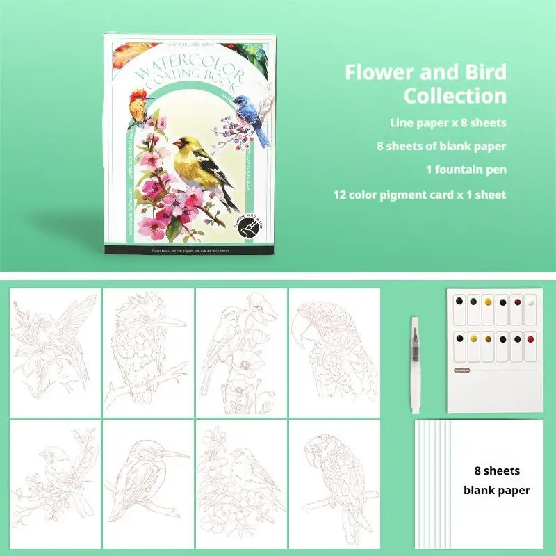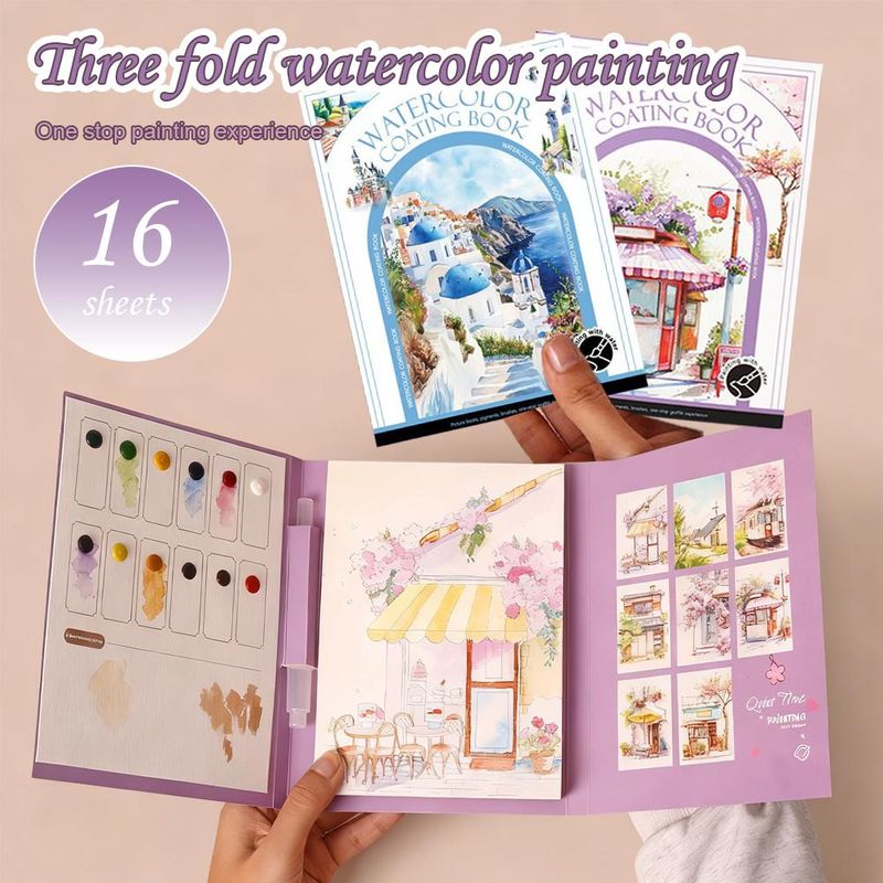 1. All-in-One Portable Art Studio: Discover the joy of painting wherever you go with this innovative tri-fold watercolor set. Designed for convenience, it offers a complete "one-stop" artistic experience. Each kit includes 8 unique line art drawing papers and 8 blank papers (totaling 16 sheets), along with a 12-color pigment dot card and a refillable water brush pen, providing everything you need to create beautiful art on the move.