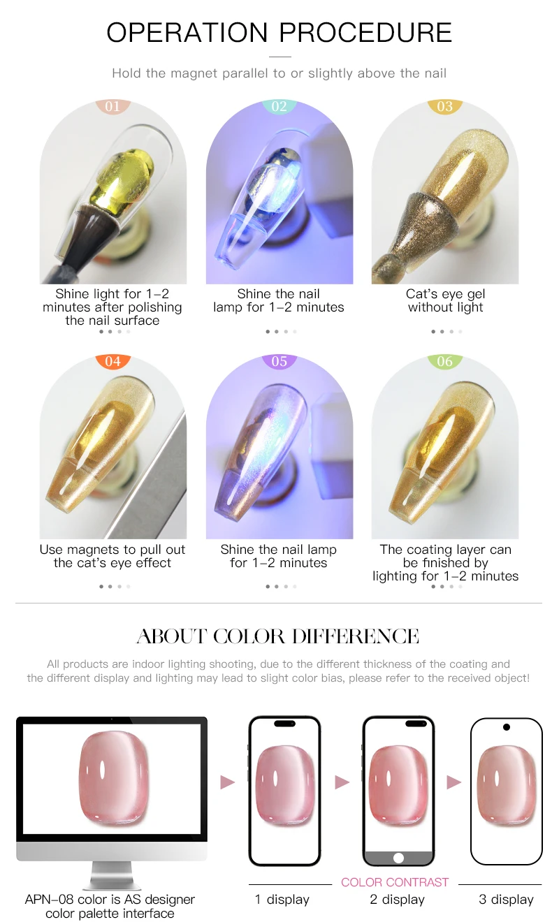 Reminder: You need to use some skills to apply this 9D cat eye gel nail polish, as for beginners, we suggest you can learn more about from videos, the practice can get a satisfying effect. Apply a base coat, two layers of gel polish, and a top coat for best results, If gel feels thick or tacky, place in hot water for 1-2 minutes, remove from water and shake well. (Skin Test before using is necessary.)