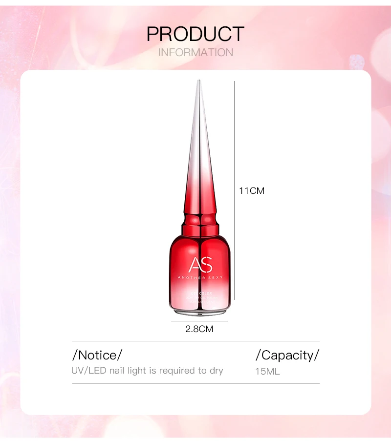 Environmental & Healthy: AS gel polish are made from natural toxin free ingredient which makes it safe and has low odor. With good tenacity and highly pigmented, premium gel material bring you brilliant shine finish, smooth appearance and flawless coverage.