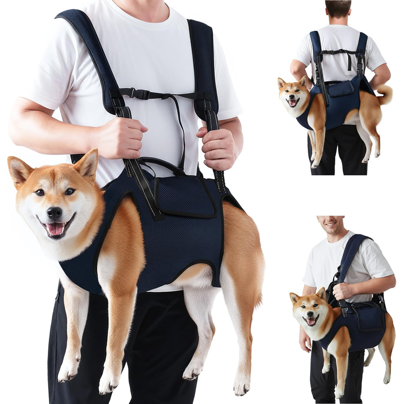 The dog lift harness supports single or dual shoulder carrying using secure buckles. Two people can use single-shoulder mode together to lift larger dogs, while dual-shoulder mode lets you carry your dog hands-free in front or back