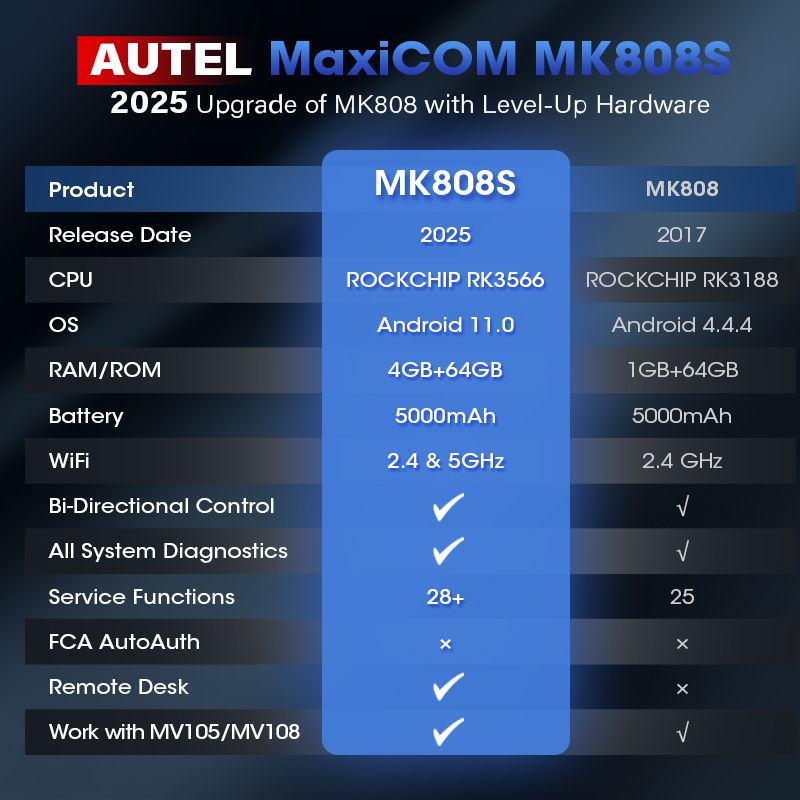 Autel has upgraded the MK808 to the new MK808S. With the same cost, you are experiencing 5X faster diagnostics and 150 wider car coverage from 1996-2026. Function as MK808BT PRO MK808K-BT MK808Z-BT, the pro-level MK808S enjoys powerful CPU ROCKCHIP RK3566, improved Android 11, larger 4+64GB, 5G & 2.4 GHz Dual WiFi, newly added Wi-Fi Print, Bi-directional Control and FCA Autoauth for Chrysler Jeep Dodge Fiat etc.